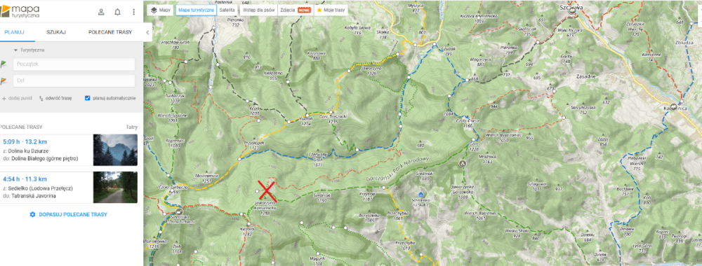 Może jeszcze taka mała podpowiedź, ja od gorca jeżdżę tym zielonym i on łączy się tam gdzie x zaznaczyłem z czerwonym, stamtąd zawsze dużo ludzi jeździ wiec możliwe, że ten czerwony jest dość prosty do podjechania, nigdy tam nie jechałem więc nie jestem w stanie się wypowiedzieć, ale na Turbaczu zawsze jest masa rowerów a bardzo rzadko kogoś mijam po drodze, więc jakimiś innymi drogami musza się tam dostawać, a obstawiam, że wybierają raczej prostsze wersje podjazdowe, więc to może jakiś trop. -