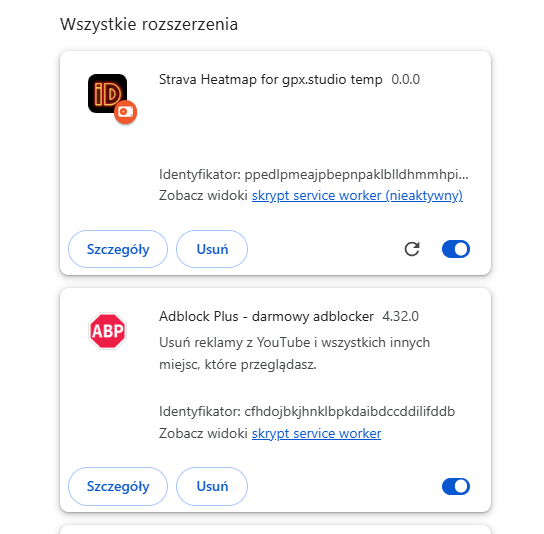 Jest już w pełni działający i w prosty sposób konfigurowalny dodatek. Działa pod mozillą i chromem " Update: The "Strava Heatmap" browser extension now works with GPX.studio! We welcome bug reports and suggestions for improvements. Please remove the temporary 0.0.0 version shared earlier. A big thank you to @vcoppe for providing the API and helping with the integration! Chrome: https://chromewebstore.google.com/detail/strava-heatmap/eglbcifjafncknmpmnelckombmgddlco Firefox: https://addons.mozilla.org/en-US/firefox/addon/strava-heatmap/ "