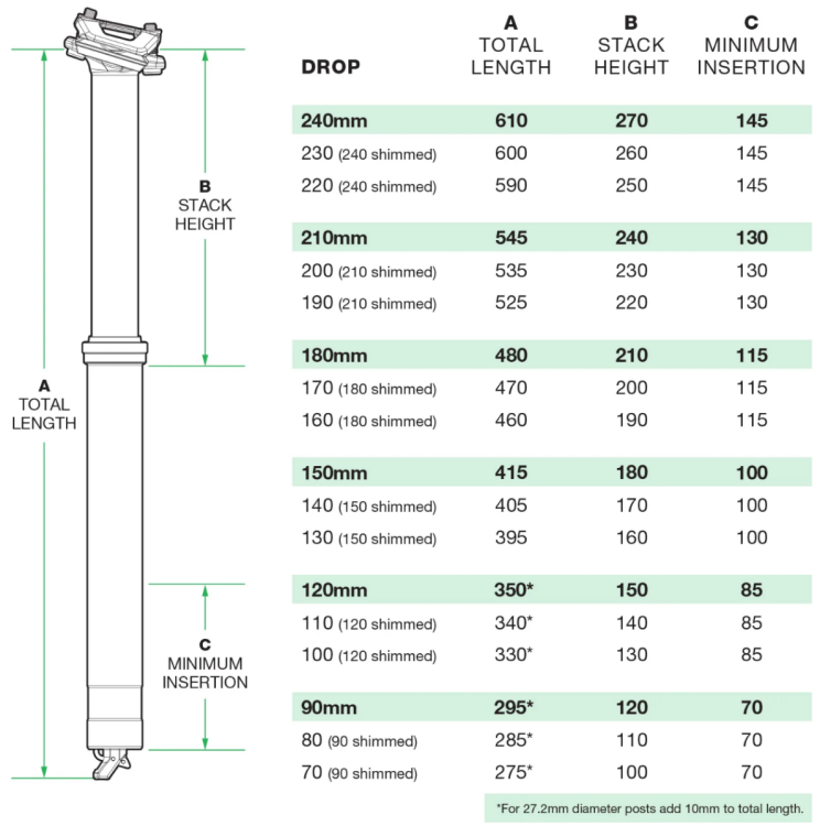 @Wojcio już Tobie odpisał. Od siebie dodam, że OneUp, to dobry wybór. Miałem i sobie chwaliłem. Nie kombinuj też z manetkami, tylko też bierz od OneUp. Ich manetki działają naprawdę bardzo dobrze, a lipna manetka może zaburzyć odbiór działania porządnego droppera. Nie wiem czy widziałeś, ale według poniższego możesz sobie pomierzyć i sprawdzić jaki rozmiar będzie najbardziej odpowiedni. Te sztyce mają nieduży "wymiar" montażowy co jest ich zaletą i często pozwala na wybór sztycy z większym skokiem. - Dzisiaj