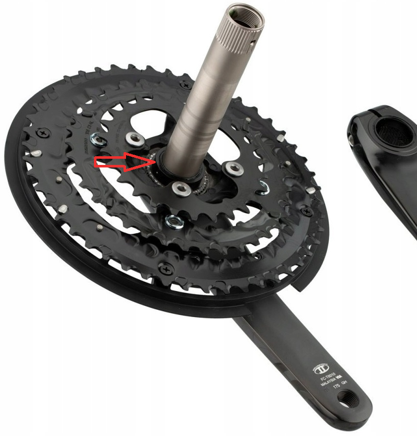 Wspomniany pierścień, to metalowo-gumowa uszczelka. Można ją spokojnie wyjąć, podważając w miejscu "rozcięcia" korby, tylko ostrożnie, żeby nie pokrzywić. Powinna być założona wargą w stronę suportu, czyli do kobry ma wejść płaską stroną. Tak jak tutaj: