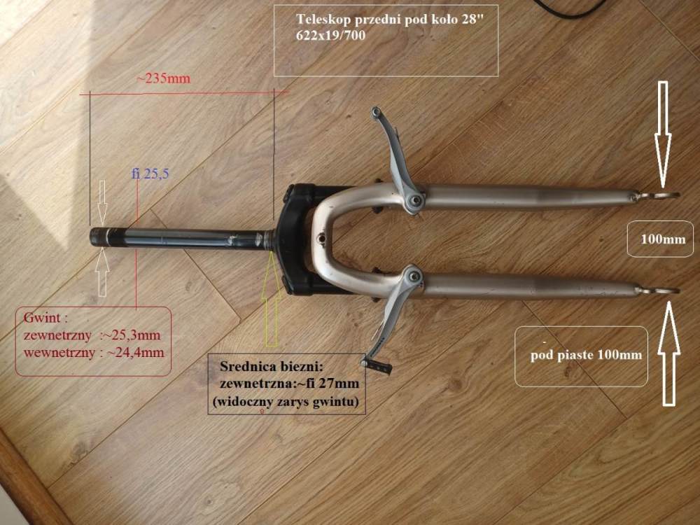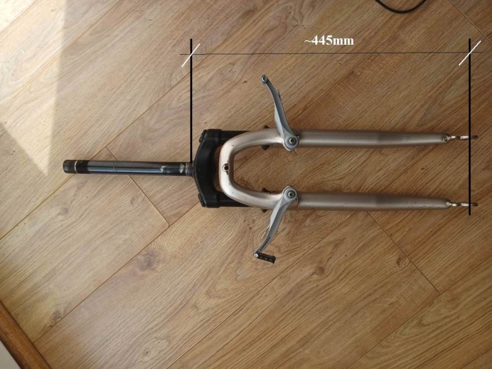 Witam. Tak jak w opisie tytułu kupię przednie widełki z amortyzatorem lub sztywne (uzywane sprawne) pod koło 28". Rower to miejski holenderski klasyk na ramie opis DESIRE CYCLES LUCCA. Poniżej ważne wymiary naniesione na zdjęciach długość od bieżni do osi kola :~445mm z tematu : [Rura sterwa -skrzywienie] przedni amortyzator do wymiany czy naprawy. .