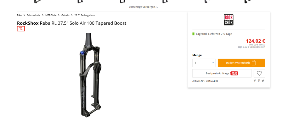 Wróciła (pewnie na chwilę bo 3 egz. w magazynie) dostępność Reby 27.5 za 124 EUR https://www.bike-discount.de/en/rockshox-reba-rl-27-5-solo-air-100-tapered-boost-1
