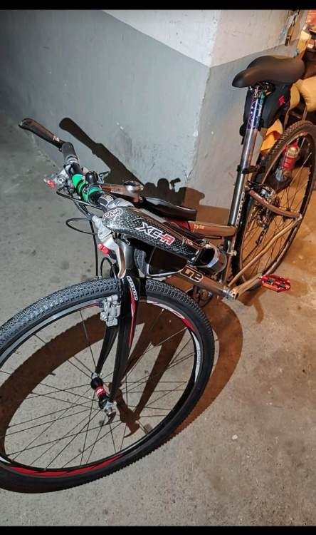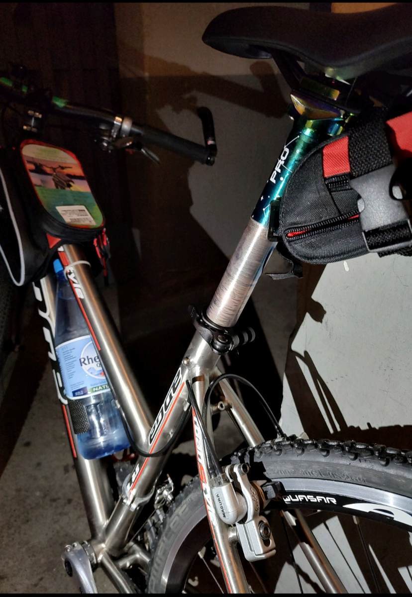 4. Udało się wyciągnąć sztycę 😅 Brunox psikany na sztycę + zamontowanie dużych pedałów i konkretniejszych opon by się rower nie wiercił dało efekt. A i od spodu brake cleanerem też lałem od strony suportu. Udało się nic nie ciąć ani nie kupować, tym razem bez kosztów. Zdarła się trochę, ale nawet ciekawie się teraz komponuje. Myślę że albo to tak zostawię albo zdobędę adapter 31.6 na 27.2 i wsadzę pasującą kolorystycznie do ramy srebrną 350mm sztycę gazelli.