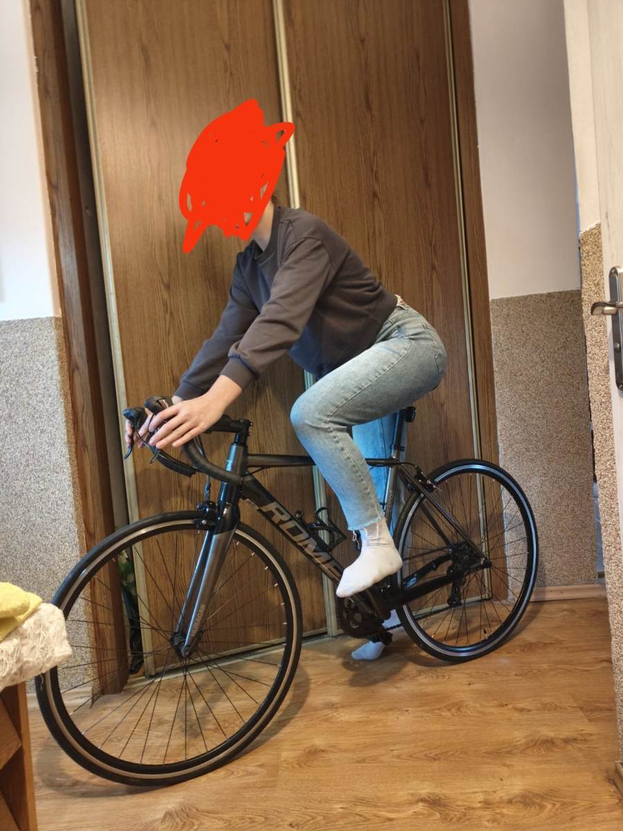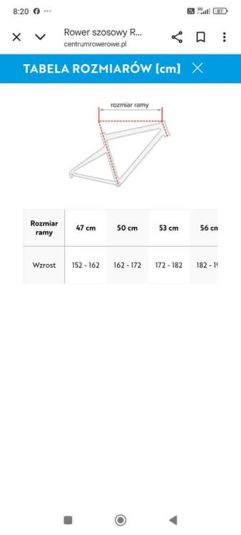 Odczuwasz ból kręgosłupa po jakim czasie? Zakładam że nim nie jeździłaś, więc ciężko to uznać za jakiś decydujący czynnik. Według mnie pozycja wygląda dobrze. To jest rower szosowy, na dodatek o dość sportowej geometrii, więc pozycja będzie pochylona. Ułożenie ciała jest zupełnie inne niż na rowerach z prostą kierownicą, zwłaszcza typowo miejskich czy trekkingowych. Tabelka którą wkleiłaś nie mówi nic. Znalazłem chyba ten rower na stronie producenta, no ale niestety tabelka z pełną geometrią jest błędna, bo w rozmiarze S Reach i długość górnej rury są większe niż w rozmiarze M. Jeżeli zamieni się te wartości, to ponownie uważam że to jest jedyny właściwy dla Ciebie rozmiar. https://romet.pl/rower-szosowy-romet-huragan-1-5384.html Kolor jest inny, ale na 99% rower jest oparty na tej samej ramie. Patrząc na to jak ten rower jest zbudowany i to, że wpisuje się w standardy klasycznej szosy, wydaje mi się że rozmiar jest prawidłowy. Mniejszy byłby zdecydowanie za mały. Patrząc na drugie zdjęcie, większy byłby za duży bo i tak jesteś już nieco wyciągnięta. Do poprawy jest także ustawienie manetek lub całej kierownicy, ciężko to wywnioskować ze zdjęcia. W pozycji wyjściowej, klamki powinny być prostopadle do podłoża. Zmiana położenia siodełka w przód/tył nie służy do regulacji odległości od kierownicy, tylko nóg w stosunku do korby. Ja osobiście bym zaczął od ustawienia siodełka na środku, a z czasem zrobił lekkie zmiany jeżeli zajdzie taka potrzeba.