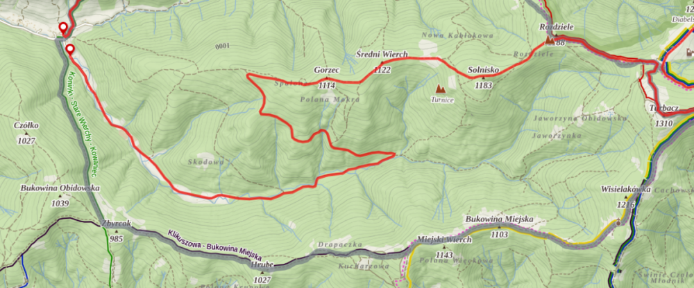 Z Obidowej na Turbacz lecie wygodna stokówka ( Trasa Narciarska Śladami Olimpijczyków) więc w miarę łatwo zdobywać tam wysokość więc to dobra opcja na rower. Ta dolna część trasy to już nie pamiętam jak tam jest ale generalnie powinno być w dół -