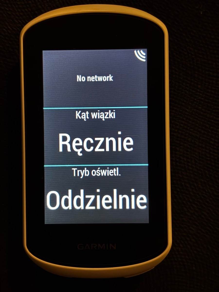 Wgrałem moje nowe ustawienia, no i mam pytania Czy te moje ustawienia w garminowskim trybie oświetlenia występują teraz jako „własne”? Dodałem do Explorera nowe pole danych Smart Bike Lights, trzy pola, i mam coś takiego jak na kolejnym screenie - „no network” (???), kąt wiązki oraz tryb oświetlenia „oddzielnie”. Jak kliknę w te pola, to tam nic nie ma do ustawienia, puste. Może po prostu ukryć ten ekran, skoro niczego nie wnosi do obsługi? I na koniec czy konfiguracja „primary” to jest ta moja? Ale dlaczego w takim razie w trybie oświetlenia stoi „oddzielnie”? Co to znaczy oddzielnie? Sorry, że tak dopytuje, ale dopiero co to wgrałem i nie mam możliwości sprawdzenia w terenie podczas jazdy. Dzięki z góry za wyjaśnienia.
