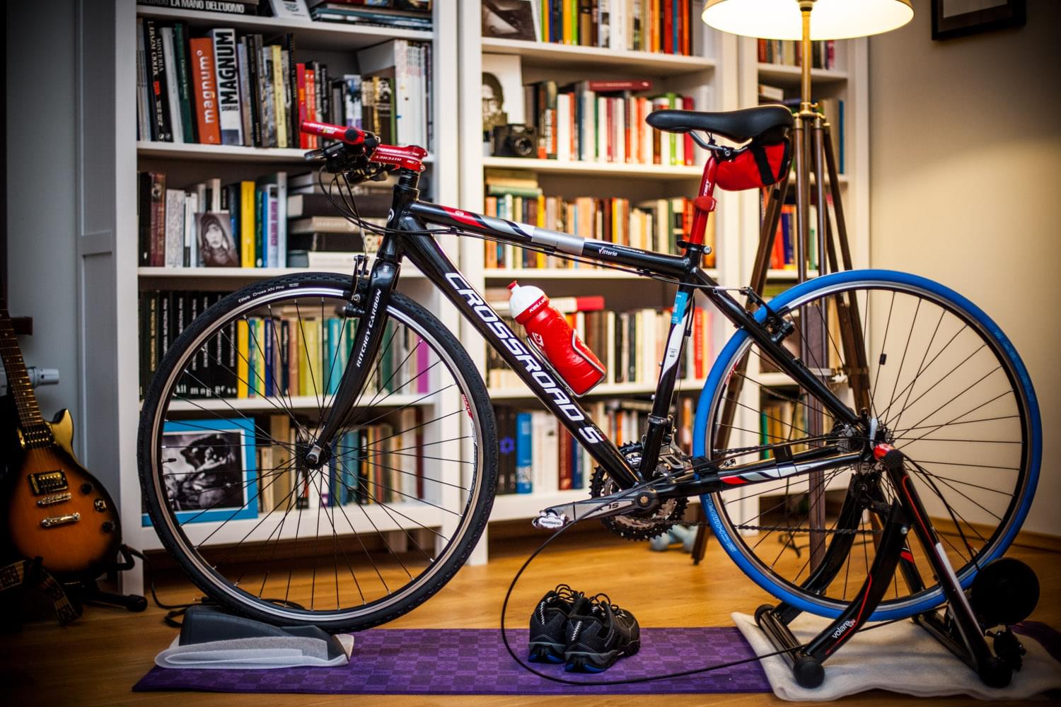 Rower typu hybryda. Składak: rama z gosportu (Crossroad 5), kompletny napęd SLX 9rz (kaseta HG80 11-28, łańcuch HG73, korba SLX 48/36/26, przerzutki i manetki SLX), pedały Shimano 520, rurki Ritchey wcs wet red (kierownica flat 600mm, mostek 100cm, sztyca). Koła: obręcze Alexrims Ace 18 na piastach Novateca, dętki lekkie Vittoria, opony crosowe Vittoria Cross XN pro (obecnie z tyłu trenażerowe Schwalbe). Hamulce v-brake: klamki deore 590, szczęki do wymiany - obecnie jakieś Alhonga. Widelec Ritchey Comp Carbon. Siodło Selle Royal. Dodatki typu pulsometr sigma 15.11 na kierownicy oraz licznik Sigma 1609 STS + CAD.