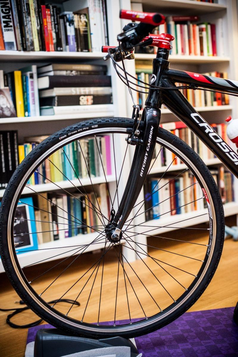 Rower typu hybryda. Składak: rama z gosportu (Crossroad 5), kompletny napęd SLX 9rz (kaseta HG80 11-28, łańcuch HG73, korba SLX 48/36/26, przerzutki i manetki SLX), pedały Shimano 520, rurki Ritchey wcs wet red (kierownica flat 600mm, mostek 100cm, sztyca). Koła: obręcze Alexrims Ace 18 na piastach Novateca, dętki lekkie Vittoria, opony crosowe Vittoria Cross XN pro (obecnie z tyłu trenażerowe Schwalbe). Hamulce v-brake: klamki deore 590, szczęki do wymiany - obecnie jakieś Alhonga. Widelec Ritchey Comp Carbon. Siodło Selle Royal. Dodatki typu pulsometr sigma 15.11 na kierownicy oraz licznik Sigma 1609 STS + CAD.