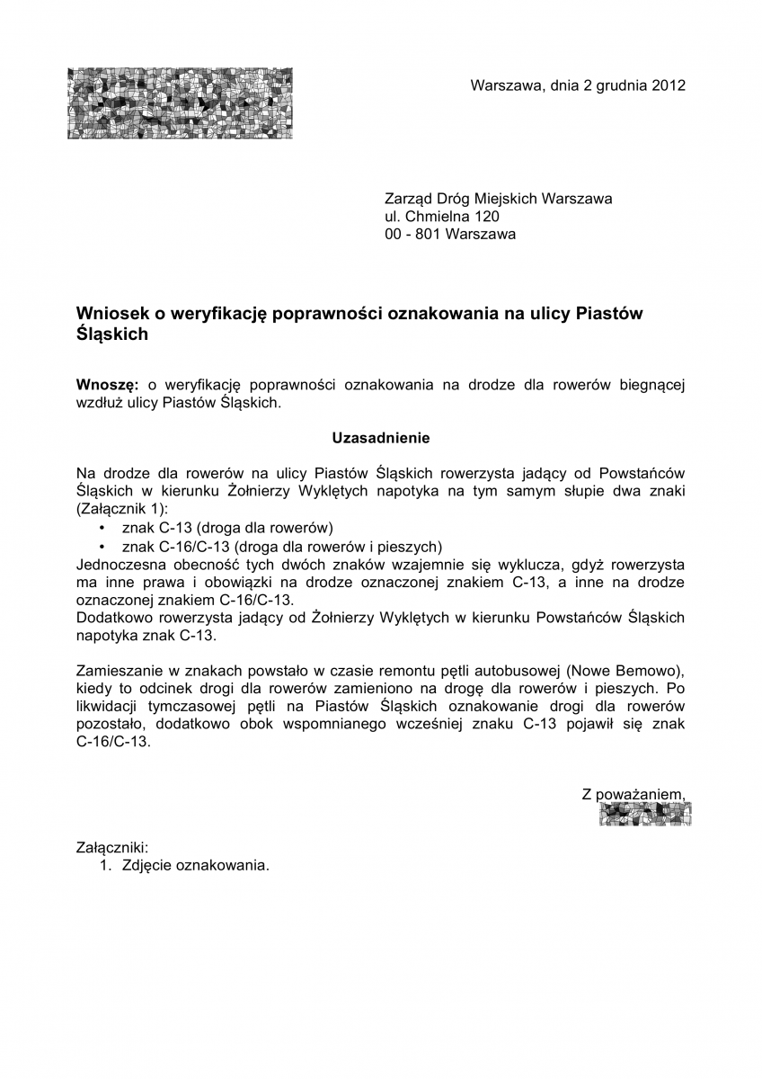 Pismo wysłane do ZDM w sprawie oznakowania DDRiP (wcześniej DDR) na Piastów Śląskich (strona 1)