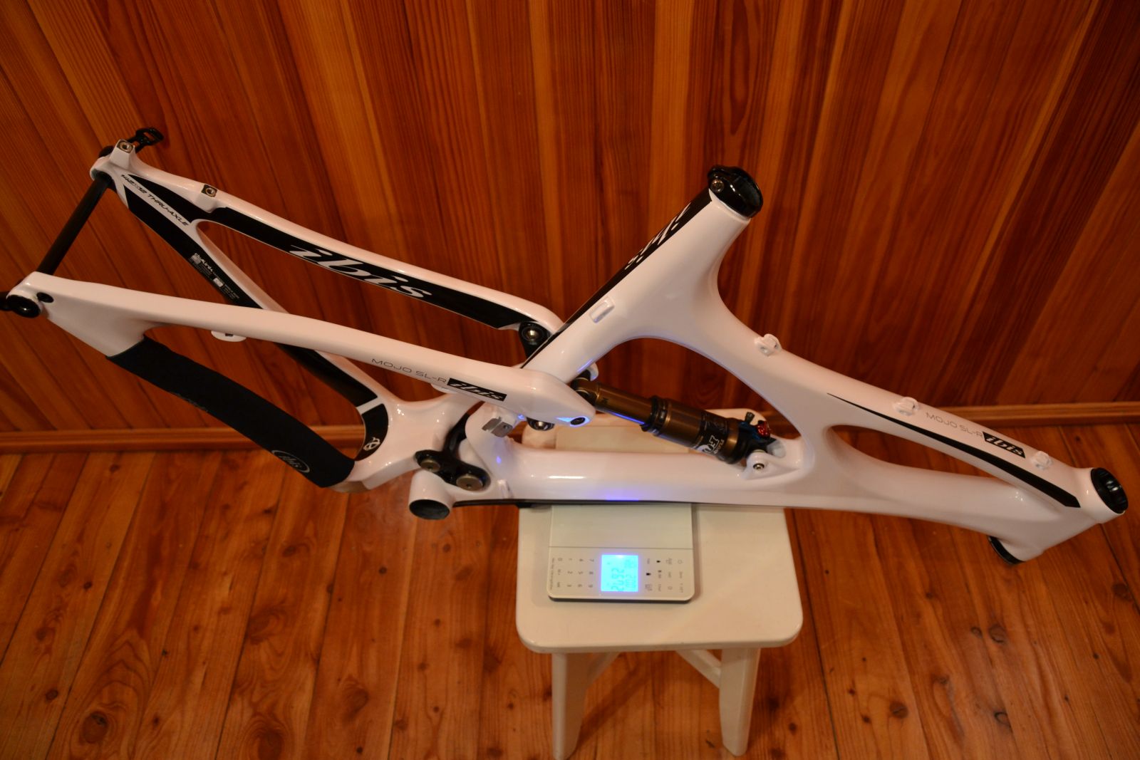 Ibis Mojo SL-R, rozmiar L, masa z damperem, osią maxle, osłonami, zaciskiem sztycy i miskami sterów - 2671g