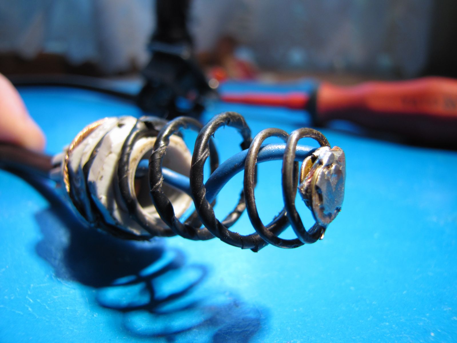 Sprężyna stalowa, doginana ręcznie, styk mosiężno-cynowy, przewód izolowany 1mm^2.