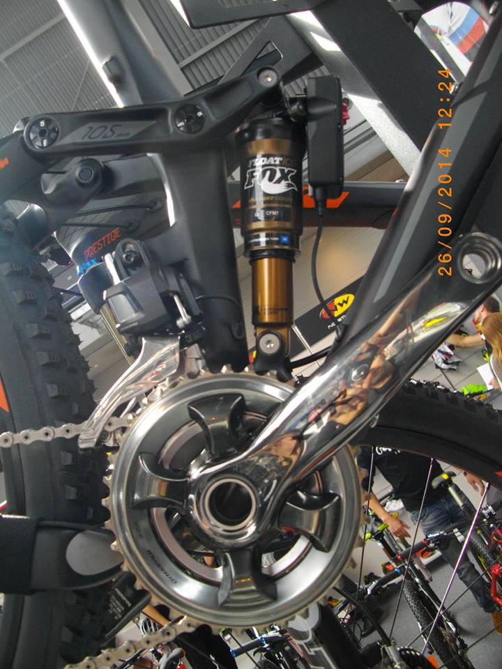 Siła zmiany przełożenia przedniej przerzutki XTR Di2 jest aż o 150% większa niż w wersji mechanicznej. Zmiana przełożeń następuje bezwysiłkowo, bez względu na pokonywany teren, na zdjęciu również elektronicznie sterowany amortyzator FOX i mechanizm korbowy XTR M9000