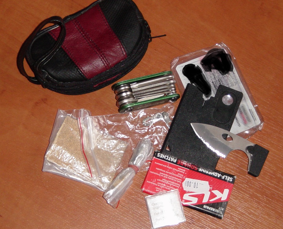 Tutaj widać to co mam w tej torebce pod-siodłowej, do tego dochodzą jeszcze chusteczki higieniczne i etui z kluczami a w nim oprócz kluczy pieniądze.