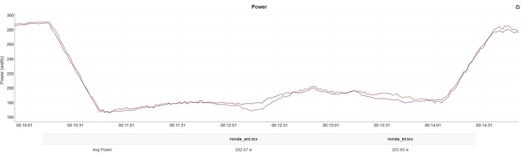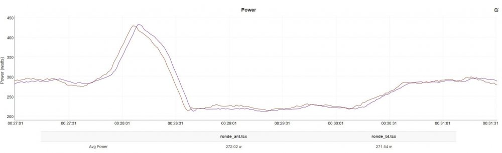 Krótka bardzo przygoda z Ronde X-power wersja II z obsługą transmisji danych Bluetooth Smart. Portale obsypane są tymi urządzeniami oferowanymi w naprawdę dobrych cenach. Gdyby się okazały solidne, byłyby ciekawą ofertą. Do tej pory testowania podjął się Shane Miller na swoim blogu, ale test dotyczył wersji pierwszej, obsługującej wyłącznie ANT+. Jako źródło odniesienia zastosowałem pedały Favero Assioma Duo, na czas testu przekonwertowane do trybu Uno, więc oba mierniki mierzyły lewą nogę. Favero ma bardzo uznaną renomę (sam również na bieżąco porównuję je z Tacx Neo), deklarowany poziom błędu pomiaru to <1%. Ronde deklaruje stopę błędu <2%. Testowa jazda odbyła się na trenażerze rolkowym, odczyt danych realizowany był z użyciem iPad Zwift (Ronde BLE), Garmin Edge 520 (Ronde ANT+) i Samsung Galaxy S7 Trainerroad (Favero ANT+). Dane przejazdu zostały następnie zgrane do plików i zapodane do narzęnia DC Rainmaker Analyzer. Parowanie urządzenia Ronde przebiegło bez jakichkolwiek problemów w obu protokołach. W opakowaniu nie znajdziemy informacji, jaki soft zainstalować na telefonie do konfigurowania urządzenia, ale podpowiadam, że jest to oprogramowanie XCadey. W jego opcjach znajdziemy między innymi zerowanie (co nie dziwi), ale również ustawianie procentowej odchyłki dla nogi (co ma jeszcze dodatkowo 4iii). A więc testy. Jazda trwała 1h40min, poprzedzona była rozgrzewką i kalibracją obu mierników. Przedstawię porównania Ronde-Assioma po ANT+, oraz Ronde ANT+ - Ronde BTLE. Na początek cała jazda: Uśrednione wyniki, jak i podążanie za zmianami mocy wyglądają dla obu mierników bardzo obiecująco, choć jest kilka sekcji wartych szczegółowego prześledzenia. Ronde ma wyraźną tendencję do zawyżania, ale różnica mieści się w 4% odchyłki. Na końcu tego fragmentu sytuacja się odwróciła i Ronde zaniżyło. Sprint - oba mierniki podążają bardzo ładnie za sobą. Ponownie kilka minut moce pow 250W, Ronde zawyża momentami sporo, ale to jednak <5% odchyłki. Sprint znowu oba mierniki bardzo ładnie. Na tym odcinku nastąpiła maksymalna odchyłka na poziomie 6%. Zauważalna jest tendencja, że czytnik zaczyna zawyżać wraz ze wzrostem kadencji. Co do kadencji - po ANT+ Ronde kadencję czyta idealnie, nie ma za bardzo co pokazywać.. Ale jeśli popatrzymy na dane kadencji z Ronde po BTLE, to nie jest do śmiechu.. Ronde po BTLE jakby żółte, po ANT+ fioletowe. Dane po BTLE są zaniżone nieakceptowalnie, im wyższa moc wyciskana na wysokich kadencjach, tym bardziej dane są przekłamane. Przy niskich kadencjach odczyty zbliżają się do prawidłowych, niezależnie od mocy. Szkoda, bo jak napisałem wcześniej, po ANT+ wszystko jest naprawdę OK. I na koniec porównanie mocy Ronde przekazywanej po NAT+ i BTLE. Jest przesunięcie czasowe na odczytach (sorry, ale za krótko używam Analyzera od DCRainmakera - nie wiem jeszcze, jak to skasować), zastanawiają jednak skromne odchyłki na wykresie danych. Co ciekawe, raz w jedną, a raz w drugą stronę.. Dane z ANT+ w tym fragmencie podążały bardzo blisko odczytów z Favero. Pora na wnioski.. Każdy może je sobie wyciągnąć sam, ale ja bym ocenił urządzenie w trybie ANT+ jako wystarczająco dobre do wspierania treningów. Przewyższa jakość odczytów wszelkiej maści trenażerów klasy niżej niż Tacx Flux lub Elite Drivo, nie wymaga kalibracji za każdym podejściem. Problem z BTLE rozwiąże pewnie nowy firmware. Czy Ronde / Xcadey ma przyszłość? Tak samo, jak Xiaomi czy Huaweii.. Nie testowałem w deszczach i na w różnych temperaturach.