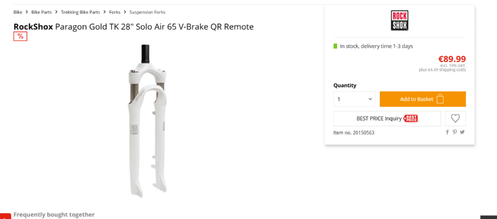 @Andrew W takim wypadku sprawa wydaje się prosta. Jeżeli jest decyzja to sugerowałbym nie zwlekać zbytnio - bike-discount ma tak że produkty w dobrej cenie które zaczynają się dobrze sprzedawać mają tę cenę podwyższaną... To jest widelec 27.5 więc produkt na chwilę obecną nie z głównego nurtu, z drugiej strony trafił już na pepper.pl więc kilku olx-owych handlowców chociazby może chcieć się zatowarować.. P.S. na bike discount zawsze można znaleźć kilka "przydasi" w dośc niskiej cenie, np. manetka M6100 za 5 EUR https://www.bike-discount.de/en/shimano-deore-sl-m6100-12-speed-shift-lever-right-without-optical-gear-display obręcz 27.5 (podstawowa dość wąska 19mm 520g ) też 5 EUR https://www.bike-discount.de/en/ghost-excalibur-xc19-27.5-disc-rim-32-holes korba STYLU DUB 170mm 32t (nie-boost) 30EUR https://www.bike-discount.de/en/truvativ-stylo-6k-dub-eagle-dm-32t-crank-170mm łańcuch 114 ogniw CN-LG500 7EUR https://www.bike-discount.de/en/shimano-cn-lg500-linkglide-10/11-speed-chain-quick-link itp itd -