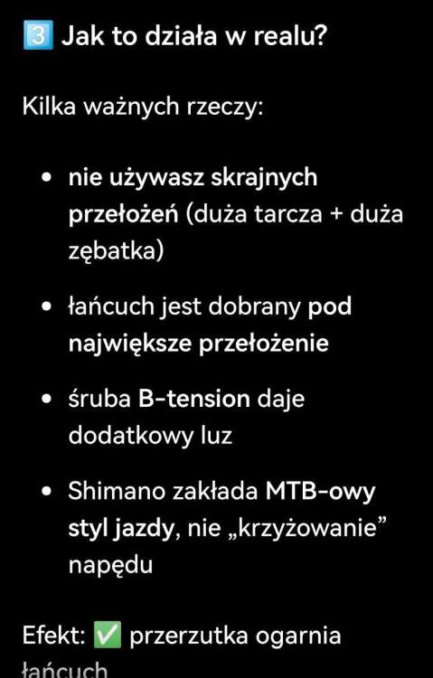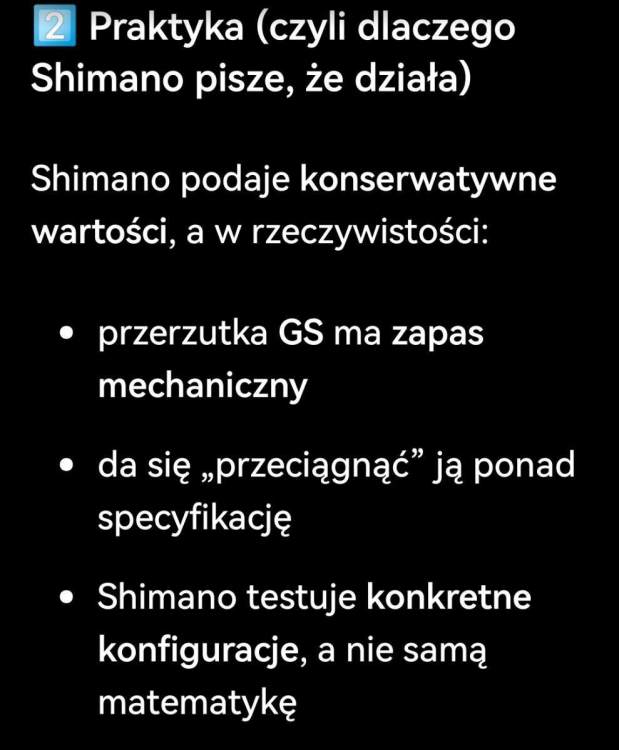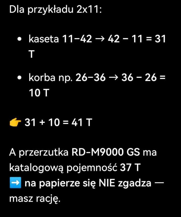 Jeszcze jest takie coś że poszukałem info na sztucznej inteligencji GP chat i odpisała mi że na papierze zgadza się że to za mała pojemność na kasetę 11-42 ale jeżeli nie używasz skrajnych przełożeń to działa bez problemowo Na tej stronie co nie wkleiłem też jest napisane że nadaje się do 2x11-40 i 42 Jeszcze coś takiego znalazłem na innej stronie internetowej techniczne: Szereg: XTR M9000 Aplikacja: Cross Country, All Mountain, Enduro Mechanizm napędowy: 11-biegowa Uchwyt: standardowy (kompatybilny z montażem bezpośrednim) Pojemność: 37 zębów (krótkie), 45 zębów (długie) Zgodność: Shimano MTB 11-biegowy Kompatybilność - Łańcuchy: HG-X11 Informacje techniczne: Rolki przerzutki: 11 zębów Materiał klatki zewnętrznej: węgiel (CFRP) Materiał klatki wewnętrznej: Aluminium Inne materiały: aluminium, stal nierdzewna, węgiel (CFRP) Zgodność: Dźwignia zmiany biegów: SL-M9000, SL-M8000, SL-M7000-11, SL-M5100 Kaseta: krótki / GS: 1x11-biegowy: CS-M9001 (11-40 T), CS-M8000, CS-M7000-11 (11-40 T, 11-42 T, 11-46 T), CS-M5100-11 (tylko 11-42 T) długie / SGS: 1x11-biegowe: CS-M9001 (11-40 T), CS-M8000, CS-M7000-11 (11-40 T, 11-42 T, 11-46 T), CS-M5100-11 (tylko 11-42 T) krótki / GS: 2x11-biegowy: CS-M8000, CS-M7000-11, CS-M5100-11 (tylko 11-42 T) długie / SGS: 2x11-biegowe: CS-M8000, CS-M7000-11, CS-M5100-11 (tylko 11-42 T) długie / SGS: 3x11-biegowe: CS-M9001, CS-M8000, CS-M7000-11 (tylko 11-40 T) Łańcuch: CN-HG901-11, CN-HG701-11, CN-HG601-11, CN-LG500 -