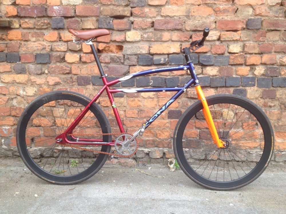 ...a o które Humu Ci chodzi - było kilka wersji na przestrzeni dziejów.  Koleś ujeżdża wersję Stars and Stripes, limitowaną bo bez uchwytów na heble, jedna taka jest w siedzibie Firmy jak mu doniesiono na targach w stajni koni.  Tamte modele były ofermowane w trzech rozmiarach, mój znajomy ma jakieś 196cm(?) i odnajduje się na 20" z kierą typu moto (fota poglądowa, stara ustawienia).  Ale.  Haki zrobione z margaryny, właściciel przymierza się do skonstruowania kopii z lekkimi poprawkami geometrycznymi.