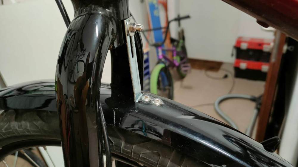 Na górnym zamiast metalowej blaszki z zestawu, zrobiłem otwór w błotniku i skręciłem połączenie śrubą.