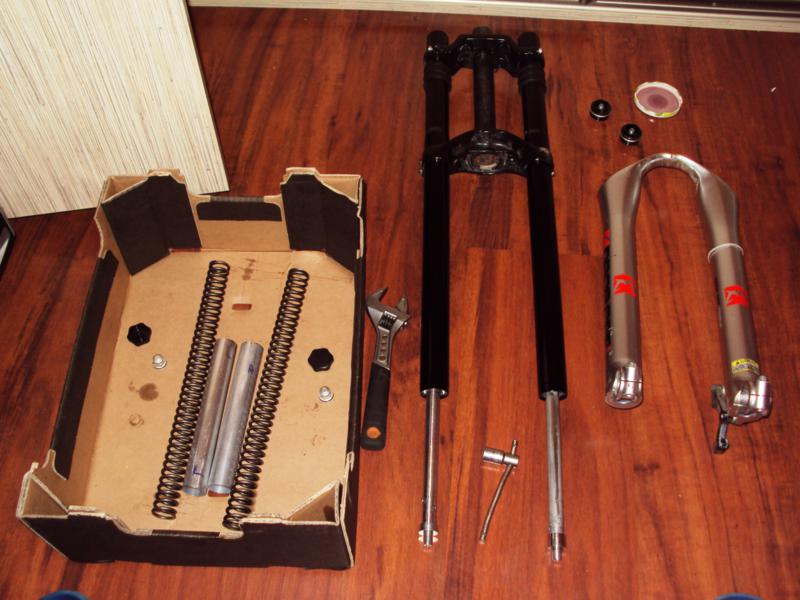 Mod Team mrmorty Napisano 25 Listopada 2013 Mod Team Napisano 25 Listopada 2013 W zasadzie to cały serwis zajmuje tyle czasu ile wypicie jednego piwa gdy w perspektywie są dwa kolejne - czyli bez większego delektowania się ale też bez pośpiechu W sieci jest sporo filmików ale i bez nich nawet laik sobie poradzi.Potrzebujemy klucz płaski 22 mm i klucz nasadowy 12 mm; naczynko na stary olej - dobrze się sprawdza pudełko po lodach 2L - wtedy można odkręcic i spuszczac olej z dwóch komór jednocześnie słoik na stary olej(słoik musi miec min 500 ml, oraz naczynko dzięki któremu dowiemy się ile to jest 245 - 250 ml. Na podłogę trochę starych gazet oraz trochę papieru toaletowego, tudzież ręczniki kuchenne do wycierania oleju.Przed serwisem należy starannie usunąc brud z okolic uszczelek kurzowych by po wyjęciu goleni nic nam do środka nie naleciało.Na początek odkręcamy zaślepki, wypuszczamy powietrze i odkręcamy korki. Najlepiej zajmowac się każdą golenią z osobna - nie zachlapiemy całego pomieszczenia. Po odkręceniu korka ukaże nam się tuleja - wyjmujemy ją, wycieramy jakąś szmatką i odkładamy do jakiegoś pudełka tudzież na gazetę. Przechylamy amor nad pojemniczkiem, wylewamy olej i łapiemy wysuwającą się sprężynę. Podobnie robimy z drugą golenią. Odstawiamy amor do góry nogami nad pojemniczkiem i albo otwieramy sobie piwo, albo robimy herbatę.10 min na spłynięcie oleju myślę że wystarczy Dalej bierzemy się za dolne śrubki. Potrzebujemy końcówki 12 mm najlepiej w miarę cienkościennej. Jeśli śrubki odkręciły się tylko częściowo a później kręcą się razem z tłumikiem to w żadnym wypadku nie wolno próbowac ich podważac - śrubki mają rowki z oringami uszczelniającymi układ i można uszkodzic oringi. W takim wypadku składamy cały układ czyli wkładamy sprężyny, tulejki i wkręcamy korki i wtedy to powinno pójśc. Jeśli nie, to pompujemy do układu trochę powietrza.Po wykręceniu śrubek i oddzieleniu goleni czekamy aż resztki oleju spłyną z dolnych lag.Nie wiem jak zamienniki, ale oryginalne uszczelki charakteryzują się dośc długim okresem eksploatacji. Oryginalne uszczelki zmieniłem dopiero w ubiegłym sezonie (sic!)Jeśli amor mocno się pocił to warto zmienic mu uszczelki, jeśli w trakcie pracy amor zostawia delikatny film olejowy na goleniach to bez paniki - jest to przeca otwarta kąpiel olejowa i taki układ już tak ma. Uszczelki przy montowaniu zazwyczaj smaruję smarem uzyskanym dzięki zmieszaniu wazeliny technicznej i odrobiny oleju do amortyzatorów.W sieci są różne informacje co do gęstości oleju. Ja mając w perspektywie jazdę w zimniejsze dni zalałem go olejem Repsol 5W który ma współczynnik lepkości zbliżony do Motorexa 7,5W. Wg producenta potrzebujemy po 245 - 255 ml na każdą goleń.Po złożeniu dopijamy herbatę a następnego dnia z bananem na ustach cieszymy się płynnym skokiem jakie dają nam sprężyny stalowe.Na koniec dodam jeszcze, że przez jakiś czas amor będzie wyrzucał nadmiar smaru którym potraktowaliśmy uszczelki wewnątrz - nie jest to nic strasznego - normalny proces(dla niewtajemniczonych - jest to moja odpowiedź na pytania typu - kurcze nasmarowałem, złożyłem a teraz golenie są ciągle tłuste) Cytuj