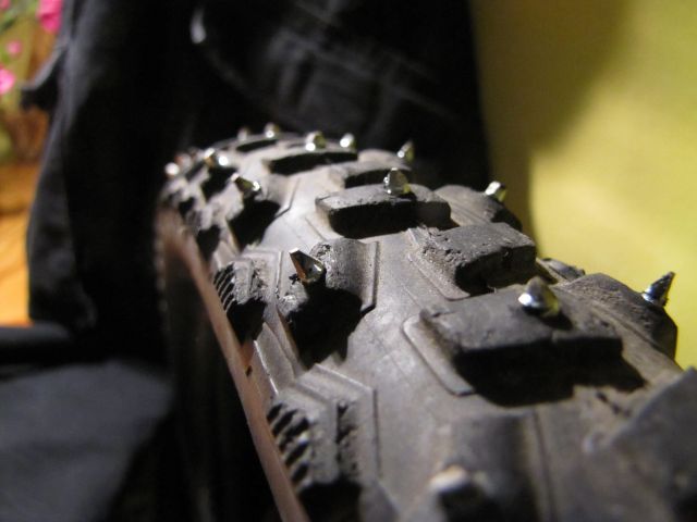 Plastyk Napisano 6 Stycznia 2014 Napisano 6 Stycznia 2014 Opony z kolcami własnego wykonania Witam,odkładam założenie tematu już prawie miesiąc, czekam na śnieg.... chyba się nie doczekam więc zakładam temat przed testem zimowym.Już od 2 lat myślałem o czymś na zimę. Przewijały się pomysły tanich opon z wysokim bieżnikiem, łańcuchów , opon z kolcami z wkrętów. W końcu pojawiła się do dyspozycji mało zużyta opona drutowa 2.1" stąd padło na 3 możliwość. Zdecydowałem że zrobię jedną, prototypową przednia oponę. Jeśli się spisze, na przyszłą zimę kupię i uzbroję drugą. Galeria Czerpałem z kilku źródeł, m.in. z tej strony (znanej zapewne tym którzy są w temacie) oraz ze stron producentów opon zimowych (Nokiana, Schwalbe) w kwestii rozłożenia i wymiarów kolców. Wstęp Materiały i narzędziaOpona - dawcą była oryginalna opona Meridy Race 2,1". Można wykorzystać każą inną, jednak trzymając sie kilku zasad. Opona musi być w dobrym stanie, żeby utrzymała w sobie wkręty oraz mieć wystarczająco wysoki bieżnik. Zalecam opony wąskie, chyba że robimy fatbike'a Kolce - 100-300 sztuk blachowkrętów, szczegóły niżej.Uszczelnienie - klej np. butapren, 1-2 tubkiZabezpieczenie dętki - inna dętka, silikon, klej... o tym też niżej.Do wykonania niezbędny będzie wkrętak krzyżakowy najlepiej wkrętarka oraz zalecam też wiertło śr. 1mm oraz coś czym będziemy wiercili.Ilość i rozmieszczeniePo policzeniu klocków (70 po środku, 2x70 po bokach i 2x70 skrajne w sumie 210szt, należy kupić nieco więcej) zdecydowałem o rozłożeniu kolców, mianowicie po środku co drugi klocek, natomiast w klockach obok, w każdym. Klocki skrajne pominąłem, dlatego, że nawet jeśli miałyby dotknąć lodu, to przy takim kącie i tak już jest pozamiatane Klocki środkowe muszą zapewnić dostateczną przyczepność podczas hamowania (ew. przyspieszania i hamowania, jeśli opona jest tylna). Należy jednak pamiętać też o wadze opony i oporach toczenia, stad decyzja żeby uzbroić co drugi klocek. Kolce boczne uzbroiłem wszystkie. Nie powodują oporów podczas jazdy na wprost, a są jedyną siła trzymającą mnie w pionie przy skręcie.Nie zalecam wkręcania wkrętów między klockami, chyba że wiesz co robisz.Długość i rodzajZdecydowałem że kolce powinny wystawać ok. 1,5mm po środku i 2,5mm po bokach, w sumie dało mi to 12-13mm długości i takie wkręty zamierzałem kupić. Wkręty muszą mieć duży, płaski łeb który będzie się mocno trzymał w oponie oraz nie będzie kaleczył dętki. Najlepiej do tego nadają się blachowkręty (zwykłe, nie samowiercące). Najlepsze byłyby nierdzewne... kto bogatemu zabroni A to jest tzw. przegięcie pały (po otworzeniu link należy poprawić - dopisać "m" w adresie strony na początku)ZakupyUdałem się więc do sklepu budowlanego (ze względu na duży wybór wkrętów w na wagę, do Lerojka).Kupiłem 2 butapreny, ku memu rozczarowaniu wkrętów bez końcówki samowiercącej dł. 13mm nie było, były samowiercące 13mm lecz bałem się żeby końcówka nie zniszczyła gumy przy wkręcaniu. Zrobiłem więc coś czego robić nie polecam, kupiłem wkręty zbyt długie (o czym niżej). Wkręty powinny mieć taką długośc jaka zakładamy, inaczej będziemy mieli dużo pracy.Technologia kosmicznaKupiłem 16mm blachowkręty w ilości prawie 300 sztuk z zamiarem ich... skrócenia o 3mm. Nie było to takie głupie, założyłem sobie że skracając będę je ostrzył w 4 płaszczyznach i tępił końcówkę, zapewni mi to większą żywotność niż oryginalny ostry szpic. To jednak jest wyjście dla ludzi którzy maja dużo samozaparcia... i kątówkę. Zrobiłem sobie uchwyt na 10 sztuk wkrętów i wszystkie uciąłem i zaostrzyłem. 80 sztuk na środek zrobiłem krótsze o 1-1,5mm niż 160 sztuk na boki. Ale czas... 50 wkrętów/godzinę jest osiągalne po pewnym czasie Grunt że się udało.Innym sposobem, jeśli nie możemy znaleźć odpowiedniej długości lub boimy się o szybkie zużycie jest skrócenie kolców np. szlifierką kątową po zamontowaniu w oponie jednak trzeba wiedzieć na co się porywamy i znać ryzyko.Zabezpieczenie dętkiJest wymagane. Nawet dobrej jakości płaskie łby mogą przebić dętkę, a jazda na kolczastym kapciu jest niemożliwa.Możliwe sposoby: - pasek z dętki - spora waga. Podobno luzem się przeciera, więc swój przykleiłem. W razie konieczności wymiany wkręta utrudniony dostęp.- silikon (umazać łby wkrętów) - nie wiem czy nie odleci, nie testowałem.- pasek mocnej tkaniny (gdzieś czytałem)- druga opona - też czytałem, chory pomysł Wykonanie Oponę należy w miarę oczyścić żeby nie brudziła wszystkiego przy robocie, szczególnie umyć, wysuszyć i odtłuścić wewnątrz np. benzyna ekstrakcyjną.Bierzemy wiertarkę (ręczną, stołową, multiszlifierkę - obroty najlepiej min. 2 maks. 5 tysięcy). W klockach które wybraliśmy wiercimy otwory przelotowe. Kąt na środku prostopadły, ale po bokach zależy od tego co chcemy osiągnąć. Można pod katem prostym, jednak również pod kątem nieco przechylonym w kierunku grzbietu opony, kto ma głowę, może próbować eksperymentować. Pamiętajmy jednak ze łby plus minus muszą przylgnąć do wewnątrz opony, dociśnie je dętka.Po wywierceniu otworów stanowisko pracy zabezpieczamy przed klejem (gazetami lub lepiej czymś twardszym, kolce podrą szybko gazety), w oponę wkładamy 2-3 elementy (np wieczka od słoików, kawałki drewna) rozchylające brzegi w celu zrobienia dostępu. Przystępujemy do wkręcania. Każdy wkręt maczamy gwintem w kleju (przykładamy do tubki, wystarczy zamoczyć z jednego boku gwintu) i wkręcamy w otwór. Należy dozować siłę, żeby nie zerwać "gwintu" w gumie ale też dokręcić na tyle, żeby dętka po napompowaniu nie wypchnęła wkręta robiąc to samo. Łatwiej te siłę dozować wkrętakiem niż wkrętarką, chyba że mamy doświ