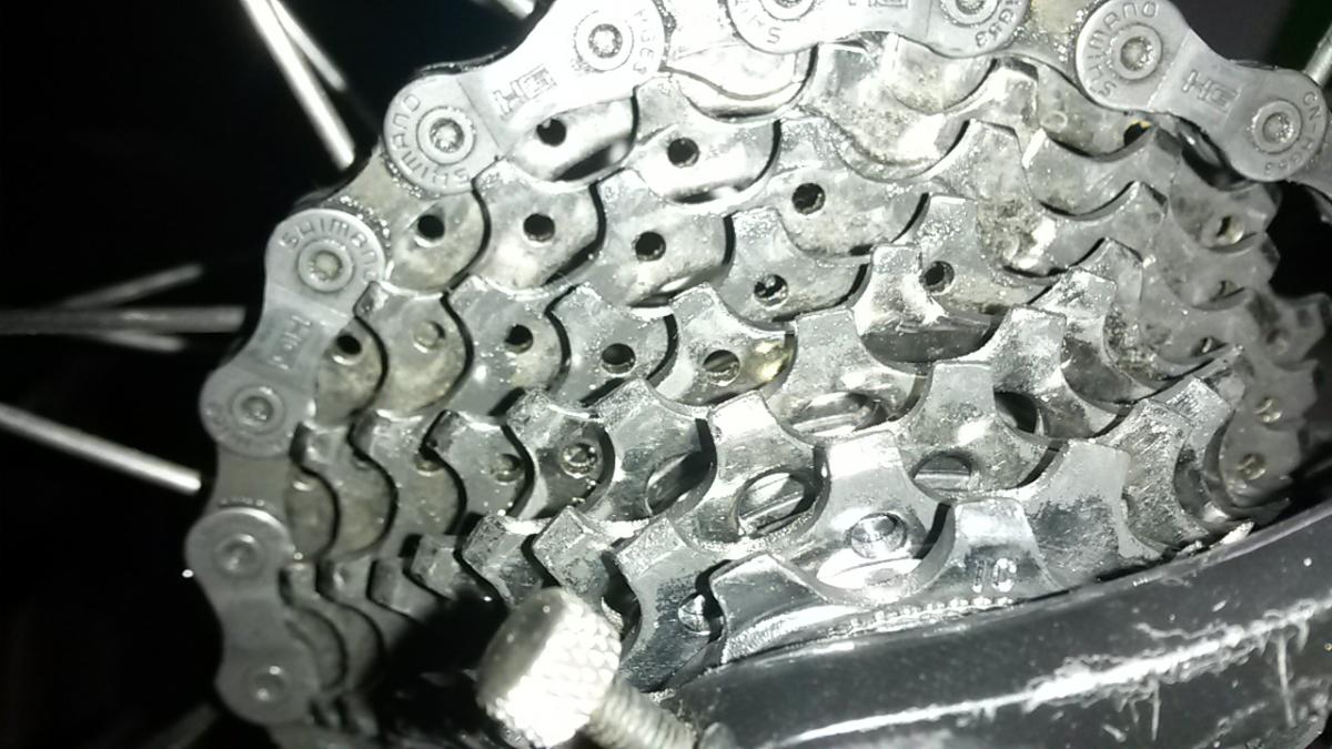 Przebieg 3500km, jazda na dwa łańcuchy campagnolo record zmieniane co 1000km, a kaseta to deore XT CS-M771 (łańcuch zaczyna już przeskakiwać na niej).