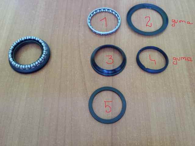 Garlock Napisano 4 Sierpnia 2014 Napisano 4 Sierpnia 2014 A masz dokładny model tych sterów? Ze strony NECO mozesz pobrać katalogi: http://www.necoparts.com/Downloads.aspx?dl=&dlc=18 Stery półzintegrowane to drugi plik (str 13-42) dla sterów 1-1/8 i 3 plik (str 43-80) dla sterów z gwintem. W każdym razie wygląda, że górne lożyskowanie to koszyczek z kulkami (1) wchodzi w bieżnię nabitą w ramę. W niego wchodzi bieżnia wewnętrzna (3) centrowana stozkowym pierscieniem nylonowym (4). Powinny być jeszcze 2 uszczelnienia. Jedno to na pewno (2) a drugiego nie widzę i nie wiem co to (5)