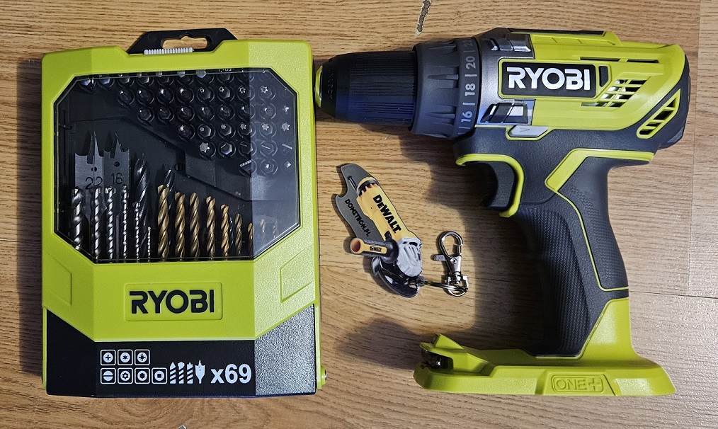Do tego podstawowa wkrętarka Ryobi z zestawem wierteł i bitów. Miałem kupić lidlowego Parkside'a, ale uznałem, że skoro mam już ładowarkę i akumulator Ryobi, to kupię coś co będzie mi do tego pasować, żeby się nie zagracać dodatkowymi akcesoriami.