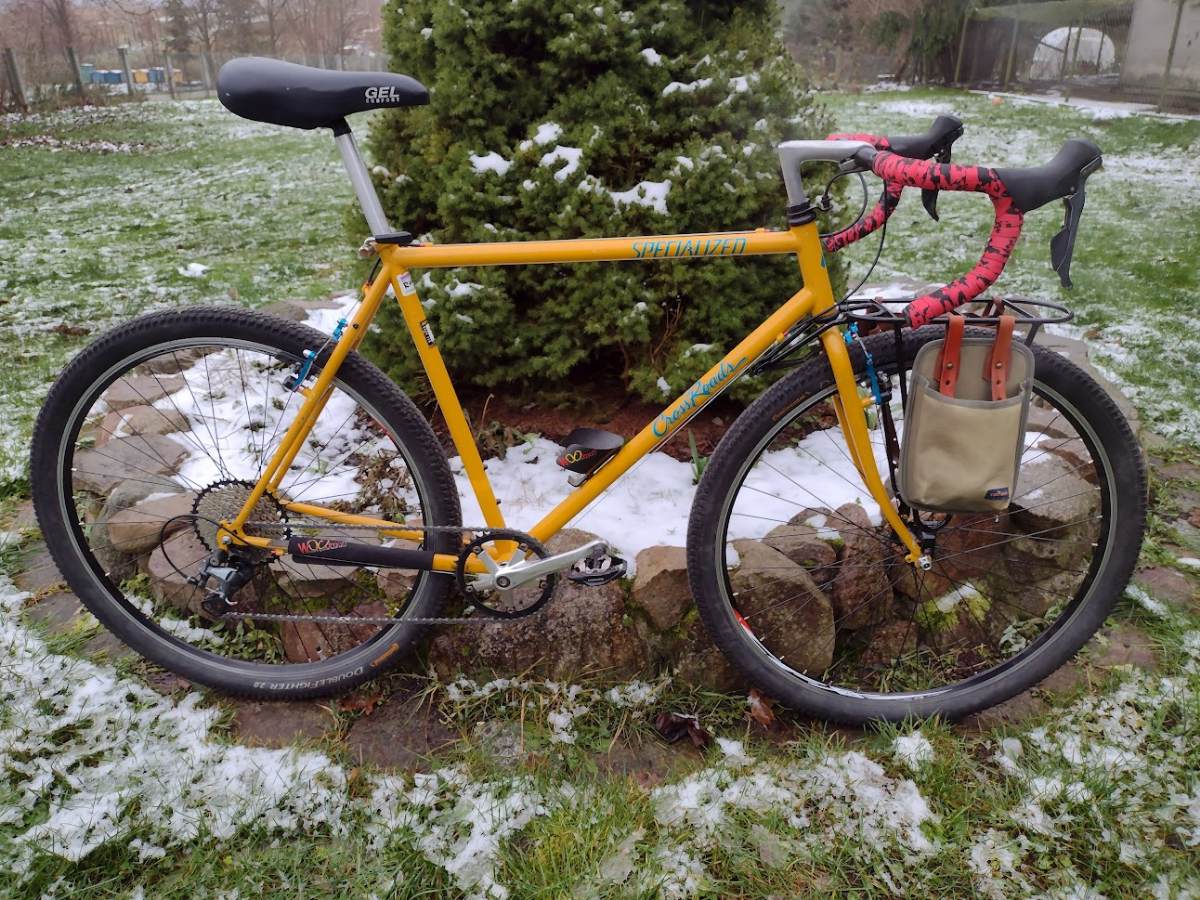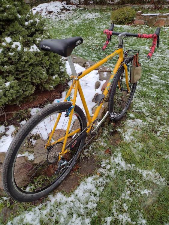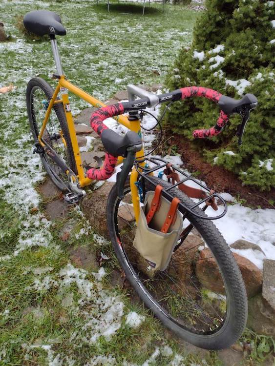 kazafaza Napisano 4 Grudnia 2022 Napisano 4 Grudnia 2022 Wczoraj. Ale już było ciemno a późno w związku z czym fokus w aparacie też nie działał najlepiej. Spesz KrosSzos ukończony. W międzyczasie wylądował na froncie bagażnik z dodatkami (uprząż na szeklę i mini-sakwa), które sprawiły że dumam nad kolorystyką całokształtu / pozbyciem się czerwieni. Albo ściągnę te przydaśki w brązie/zieleni albo tymi kolorami będę grać w siodełko i owijkę. 1 Cytuj