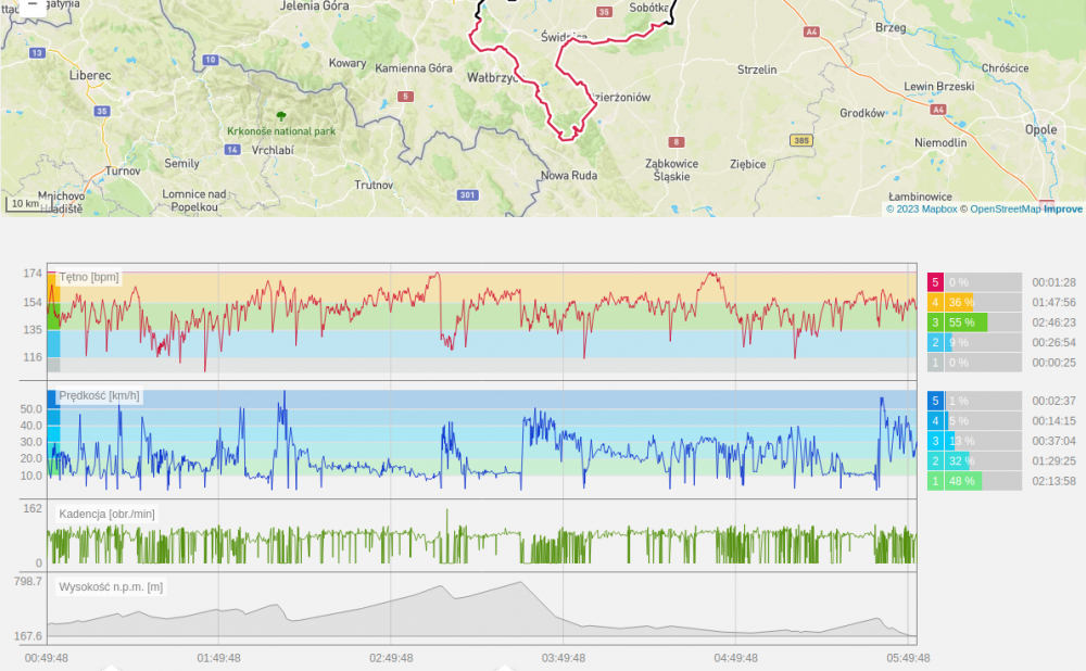 spidelli Napisano 28 Maja 2023 Napisano 28 Maja 2023 @FigoiFago Masz podjazd z Zagórza do Sokolca zaliczony? To jest 10 km pod górę, początek taki sobie ale końcówka już dość mocno nachylona. Ja tam wjeźdżam już siłą woli (wcześniej mam jeszcze kilka podjazdów, np. Bogaczowice, Struga, Dziećmorowice). Najbardziej cierpię, jak mnie goście na szoskach mijają na tej ściance na końcu To fragment mojego tripa na 300 km - zaznaczony odcinek najbardziej górzysty - okolice Wałbrzycha i Góry Sowie, na dokładkę Tąpadła - wygląda jak zmarszczka. Niestety nie mam całego tripa w jednym pliku, bo padł mi licznik, kilka kilometrów dograłem jeszcze na nim, a pozostałe 60 - na zegarku. Cytuj