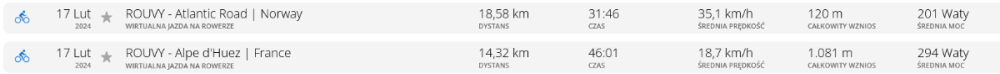 TheJW Napisano 17 Lutego 2024 Napisano 17 Lutego 2024 (edytowane) Dzisiaj (znowu...) sesja trenażerowa na Rouvy. Najpierw pod górę, Alpe d'Huez. Potem po płaskim w Norwegii, bo było mało. Później zmieniłem łańcuch w szosie. Trochę zaspałem i jestem ciekawy, czy nie będzie przeskakiwał na kasecie trenażera... Jeszcze blat na "stole warsztatowym" wymieniłem, bo go jakiś czas temu trochę wygiąłem. To tak naprawdę jakiś skręcany blaszany regał rozłożony na pół, więc nie było trudno. Muszę wymyślić jakieś wzmocnienie i mam już koncepcję - jutro będę dłubał. Edytowane 17 Lutego 2024 przez TheJW Cytuj