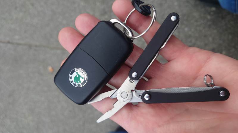 Wreszcie - dyskutowałem kiedyś z @wkg , który poddał w wątpliwość wożenie nierowerowego multitoola. Ja broniłem tego pomysłu z punktu widzenia sakwiarskiego - skoro wożę zapasową linkę, to czemu nie mieć kombinerek ;) Jednak mój "stary" Leattherman, który ma z 5 śrubokrętów, dwa ostrza a nawet piłkę faktycznie jest za duży i za ciężki. zmieniłem go na mniejszy i lżejszy model, który ma miniaturowe kombinerki (linkę utrzymają, sprawdzałem), ostrze, którym nic szerszego nie przekroję i maleńkie nożyczki  (te akurat mogą się przydać, żeby dociąć plaster czy przyciąć zadarty paznokieć).