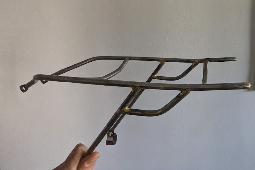 1. Przemodelowałem nieco swój bagażnik/stelaż podsiodłowy - pierwsza wersja miała w złym miejscu pionowe tyczki, przez co wystawało całkiem sporo platformy bez podparcia i w efekcie jazdy terenowej było to podatne na gięcie się samoczynne. Poniżej wersja 1.1, 100% recyklingu ;) tyczki przelutowane w inne miejsce i pod innym kątem, końcówka skrócona i zaślepiona, a z tego co odciąłem dorobione wzmocnienia wsporników. Już w łapach czuć, że całość jest sporo sztywniejsza, także wróżę sukces.