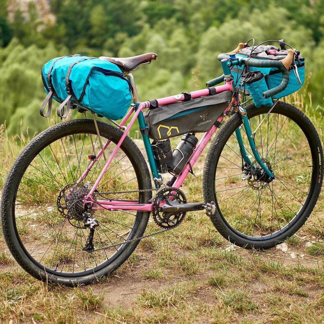 Najbardziej przydatną w rowerze (bikepackingowo) przestrzeń ładunkową, czyli główny trójkąt ramy, masz w większości niewykorzystaną. Przez to musisz wozić absurdalnie duży odwłok, który najbardziej przeszkadza w czasie jazdy. Na przyszłość - przenieś bidony gdzie indziej (na widelec, lub przy mostku w paśnikach) a w trójkąt pakuj pełną torbę, to jest najlepsze miejsce na wożenie ciężkich rzeczy typu jedzenie/gotowanie itp. a do tego można w wolne miejsca upchnąć masę szpargałów, czy nawet jeden z bidonów.