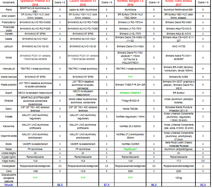 Bad Napisano 28 Stycznia 2017 Autor Napisano 28 Stycznia 2017 (edytowane) Zrobiłem porównanie rowerów z oceną każdego z komponentów. Nie umiem dobrze rozpoznać każdej części, która jest lepsza lub gorsza. Parę rzeczy brakuje, jeżeli możecie to zerknijcie czy jest wszystko dobrze i może napiszcie o co uzupełnić tabelkę lub gdzie zmienić ocenę. Tabelka Edytowane 28 Stycznia 2017 przez Bad Cytuj