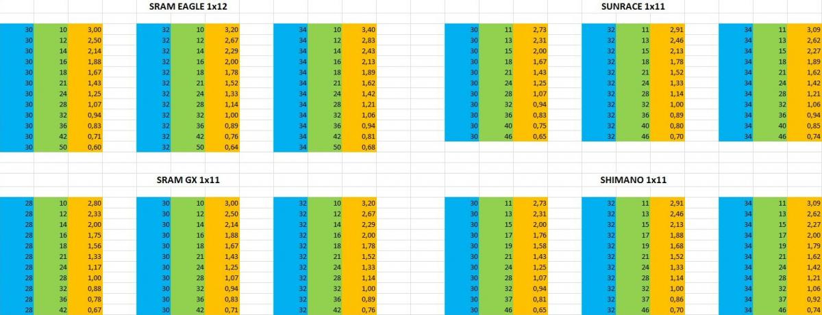 Tylko, że Shimano ze swoją kasetą 11-46 może co najwyżej konkurować z 11-rzędowym SRAM'em. Zamieszczam wykres excela jaki kiedyś sobie zrobiłem by dokładnie zobrazować różnice. I tak w skrócie Shimano 30T + kaseta 11-46 to odpowiednik SRAM 28T + kaseta 10-42. SRAM Eagle z tarczą 32T + kaseta 10-50 zapewnia miękkie i twarde przełożenie.