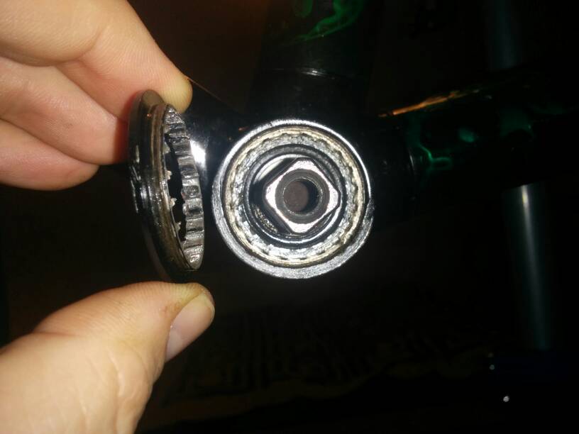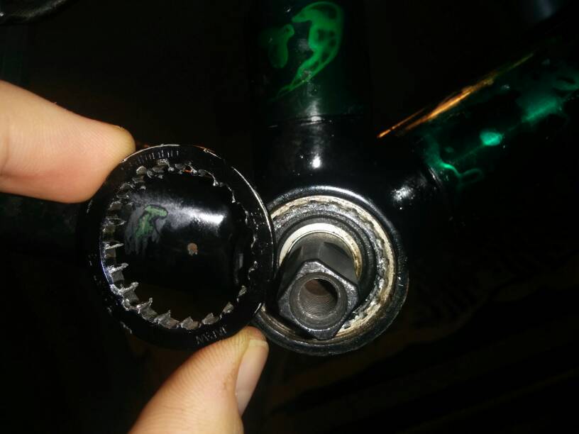 Yossarian Napisano 28 Listopada 2017 Napisano 28 Listopada 2017 Może ktoś doradzi mam poważny problem z demontażem suportu na kwadrat. Odkręciłem bez problemu mufę z tworzywa po lewej stronie. Nie udało się odkręcić aluminiowej po stronie napędowej. WD40, grzanie opalarką, ani drgnie. Przy rozwiązaniu siłowym z dźwignią pękła. Zerwała się i wykręciła na głębokość nacięć na klucz do suportu. Reszta została w środku. Czy możliwe jest wybicie suportu w kierunku z prawej strony na lewą i później wycięcie prawej aluminiowej mufy precyzyjną mini szlifierką? Rama roweru stalowa. Czy może coś blokować wybicie suportu, np. czy możliwe jest że z prawej strony nie ma mufy tylko gwint znajduje się bezpośrednio na suporcie i wybicie go będzie niemożliwe. Będę wdzięczny za rady. Poniżej fotka jak to wygląda teraz od uszkodzonej strony napędowej. Nie ma żadnego oznaczenia jaki to suport, jest od nowości i napisane jest tylko Japan, a rower to 25 letnia Merida w całości na osprzęcie XT. Wysłane z mojego Nexus 5 przy użyciu Tapatalka