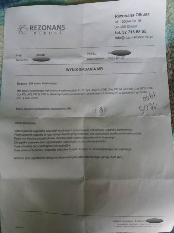bastard83 Napisano 4 Października 2021 Napisano 4 Października 2021 (edytowane) Wynik MR kolana prawego, jeszcze przy okazji czeka mnie MR kolana lewego. Poniżej opis badania. Cytat OPIS:Miernie nasilone przeciążeniowo-zwyrodnieniowe podwyższenie sygnału rogu tylnego łąkotki przyśrodkowej i rogu przedniego łąkotki bocznej, bez pęknięć. Prawidłowa chrząstka stawowa przedziału przyśrodkowego i bocznego. Rzepka typu II , w pozycji badania w niewielkiej lateralizacji. Chrząstka stawowa przedziału rzepkowo-udowego zachowana w normie. Umiarkowane, wrzecionowate pogrubienie dystalnego odcinka pasma biodrowo-piszczelowego na poziomie górnej krawędzi kłykcia bocznego udowego, z pasmowatym obszarem podwyższonego sygnału oraz z niewielkim obrzękiem wokół - ITBS zespół pasma biodrowo-piszczelowego? ( - w ankiecie Pacjent zaznaczył że uprawia kolarstwo). Poza tym aparat więzadłowy stawu zachowany. Nieco zwiększona objętość płynu w stawie . WNIOSKI:ITBS (zespół pasma biodrowo–piszczelowego) . Z tym uprawianiem kolarstwa to poszalałem, wiem. Po prostu jeżdżę na rowerze czego nie robiłem kilkanaście lat. Edytowane 4 Października 2021 przez bastard83 Cytuj