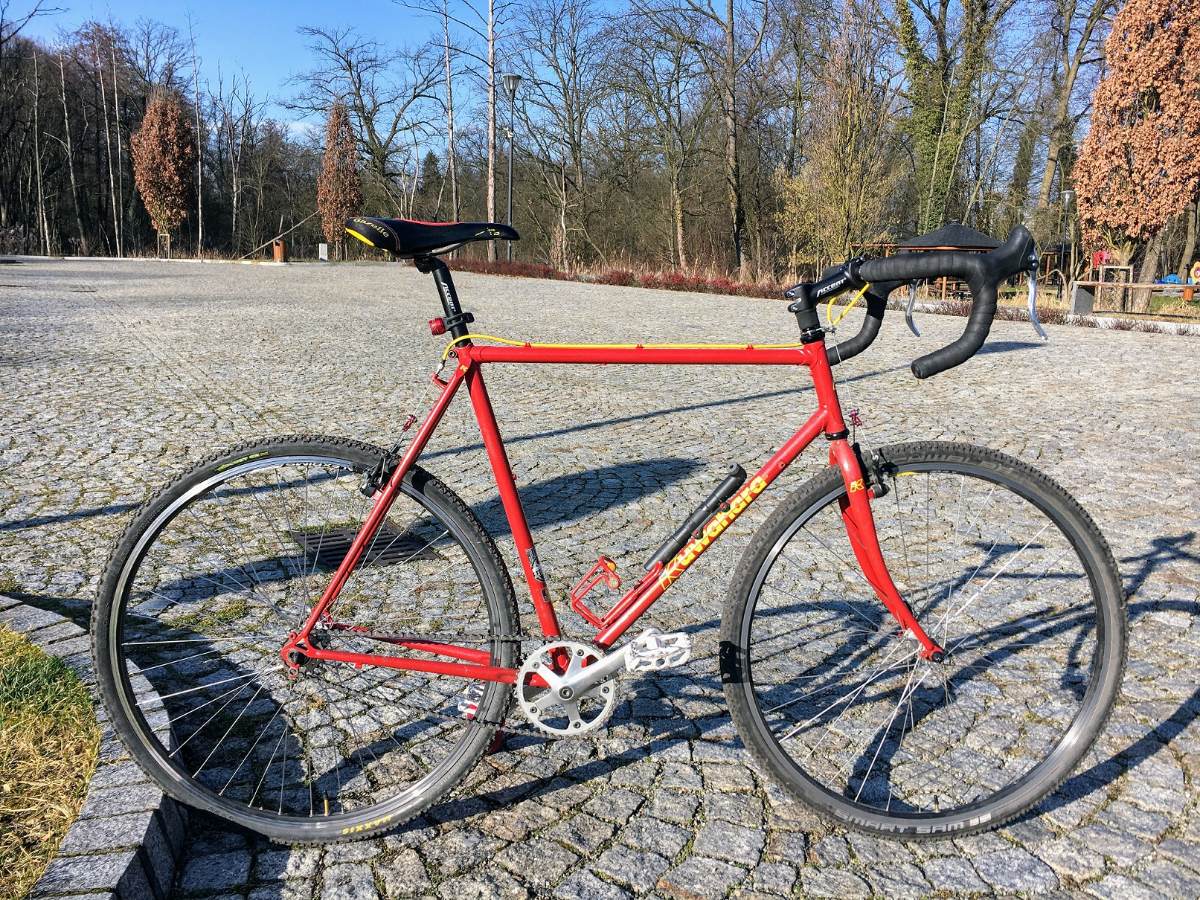 akkwlsk Napisano 17 Kwietnia 2021 Napisano 17 Kwietnia 2021 Siema, w myśl zasady "jeśli nie używałeś klamota przez rok, to znaczy że go nie potrzebujesz" sprzedam Kuwaharkę. Poczwórnie cieniowane rurki Ishiwata EXO, widelec Tange, rozmiar 57cm. Rama rocznik '88 odmalowana w ładnym, czerwono-ceglanym kolorze pokrytym dodatkowo klarem metalik. Na żywo wygląda super, warstwa lakieru jest cieniutka więc mufy i inne szczegóły nie są brzydko zalane. Malowanko było w 2016, więc w niektórych miejscach lakier lekko zmatowiał, ale dalej wygląda nieźle. Ramka aktualnie stoi ubrana tak jak na pierwszym zdjęciu, czyli wersja SSCX: - koła na obręczach alexrims ACE18 (17mm wewnętrznej szerokości) i piastach shimano, tył XT przód deorka, - Opona tył Maxxis Locust (na wykończeniu) przód świeże schwalbe smart sam, obie 35c - sztyca i mostek accent, mostek na adapterze pod ahead, siodełko jakieś Gazelle, bardzo wygodne i w ładnym stanie, - kiera Deda Elementi cośtam 46cm, klamki Tektro, podwójna owijka PRO (wiem, wiem, nie można) żeby na szuterku było mięciusio. - szczęki canti shimano LX czorne, - stery Tange na maszynach, - korba RX100 z blatem Gebhardt 42z, suport na maszynach, nie pamiętam jaki, ale działa Cena za rower tak jak stoi wyżej to 900zł, na pozostałych fotkach pokazane inne wcielenia żebyście sobie mogli zwizualizować w co można Kuwaharke przepoczwarzyć. Wady niekryte: - tylny trójkąt był rozciągany pod 135mm, więc żeby biegi działały piko bello trzeba by sobie hak naprostować, - chainstay od środka przetarty w miejscu kontatku z oponą, bo kilka razy udało mi się przesunąć koło w hakach jeżdżąc singlowo i oponka zrobiła swoje, - jest pajączek pod zaciskiem sztycy - z takim ramę kupiłem, nic się z tym nie dzieje i nic z tym nie robiłem, ale jest to informuję (prawdę mówiąc to wszystkie moje stare ramy cro-mo taki miały i w żadnej pęknięcie nie postępowało). Mam jeszcze sporo gratów do niej, między innymi: - komplet błotników SKS (ale błotniki nie działają z oponkami 35mm, używałem ich w wersji szosowej ze slickami 28mm) - Oponki Conti Ultra sport 28c (jedna zwijana druga drut, stan dobry), - kompletny napęd 3x7 shimano DX z manetkami typu thumb, korbą, przerzutkami i kasetą, łańcuch też się znajdzie. - klamki cantilever pod prostą kierownicę, - mostek quill gdyby komuś przeszkadzała konwersja pod ahead, - tylne koło pod ostre (obręcz Rodi na piastuni przedniej shimano z mocowaniem zębatki w miejscu tarczy hamulcowej ) - pewnie jeszcze jakieś graty, o których aktualnie zapomniałem. Jeżeli ktoś by sobie winszował któreś z tych dodatkowych fantów przygarnąć razem z rowerkiem, to się dogadamy co do ceny. Rowerek stoi koło Gliwic, można się dogadać co do oględzin a może nawet wysyłki jak będę miał dobry humor. Gdyby ktoś był poważnie zainteresowany, to mogę oczywiście zrobić szczegółowe fotki, pod warunkiem że przestanie lać deszcz.
