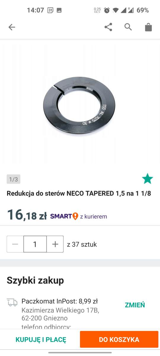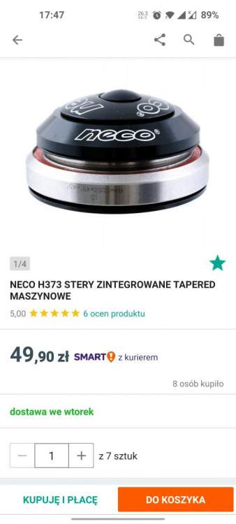 RafalxM Napisano 18 Października 2021 Napisano 18 Października 2021 51 minut temu, adonim85 napisał: Warto się nad tym zastanowić? czy odpuścić? Używam takiego - rura 44 , miska dolna EC44/52 , plus taka redukcja bo widelec ma rurę prostą i ma przy koronie 30 mm średnicy. Ja się nie miałem co zastanawiać, bo stery EC44/30 kosztują 600-900 zł , także jakoś mi to nie pasowało