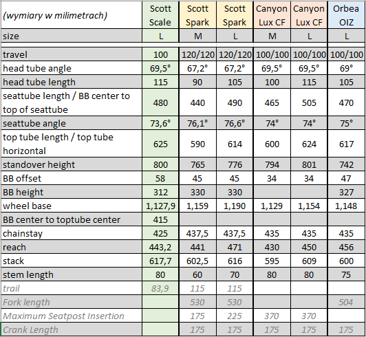 TheJW Napisano 20 Stycznia 2022 Napisano 20 Stycznia 2022 Najszło mnie na zakup nowego roweru. Stawiam na Sparka RC z rocznika 2022. Siadłem na spokojnie i myślę...oglądam, porównuję, zestawiam, rozrysowuję... Im więcej dumam, tym mniej wiem i bardziej się gubię. Czy na podstawie konkretnych, poniższych modeli i ich geometrii zestawionej w tabeli, jesteście mi w stanie wyjaśnić jak krowie na rowie, o co w tym chodzi, jak to "czytać", co ma wpływ na co i jak dany rower będzie się (w teorii) zachowywał w określonych sytuacjach? Może dzięki temu będę w stanie wybrać rower odpowiedni dla siebie pod względem dopasowania i efektywności, a nie "napalenia się" i zakochania. Moje wymiary: 181/182cm wzrostu, przekrok ~88cm. Przeznaczenie roweru: techniczne single/pętle XC, zabawa w mazowieckich lasach, maratony na Mazowszu i w Świętokrzyskiem, górskie etapówki, dobra zabawa podczas urlopu w górach, okazjonalnie wyścigi XC. Zależy mi przede wszystkim na responsywności roweru oraz w miarę stabilnym zjeżdżaniu (techniki nie mam najgorszej, nie boję się zjeżdżać, więc nie potrzebuję kanapy, która sama spłynie w dół). Tabela porównawcza. Na zielono zaznaczona geometria mojego obecnego roweru, z którym dobrze się "dogaduję". Interesujące mnie modele: Spark RC Team https://www.scott-sports.com/global/en/product/scott-spark-rc-team-issue-axs-bike?article=286262010 Canyon LUX CF https://www.canyon.com/pl-pl/rowery-gorskie/cross-country-bikes/lux/cf/lux-cf-7/3134.html Orbea OIZ https://www.orbea.com/pl-en/bicycles/mountain/oiz/cat/oiz-m10 To, co wydaje mi się, że rozumiem: - kąt główki ramy - im łagodniejszy (np. 67 względem 69) tym rower przyjemniej zjeżdża, ale jest bardzie "leniwy" w prowadzeniu, mniej responsywny - kąt rury podsiodłowej - im ostrzejszy, tym bliżej przodu przesunięty jest środek ciężkości, co pomaga np. w podjeżdżaniu (pomijając pozostałe długości i kąty). Tutaj chyba nie jest jednak tak łatwo, bo jedni podają wartości realne, inni wirtualne... - przekrok - wiadomo...bufor bezpieczeństwa przed zgnieceniem jajec 😜 - baza kół - długość całego roweru - chainstay - im krótszy, tym rower zwinniejszy i bardziej zrywny - offset/wysokość/obniżenie suportu - opuszczenie suportu względem osi kół/prześwit ramy Szczególnie zależy mi na zrozumieniu zależności długości rur, wartości reach i stack. Ogromna prośba o skupienie się na geometrii i zachowaniu rowerów w terenie. Cena, dostępność, specyfikacja, waga, wygląd itd. nie są tu istotne. Być może wybiorę model wyżej lub niżej.