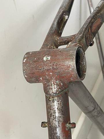 SQ9KQY Napisano 17 Czerwca 2022 Autor Napisano 17 Czerwca 2022 Rama wstępnie wyczyszczona ze starej farby. Było kilka warstw, czerwony podkład, biały, zielony i seledyn. Z przodu nie ma śladów po nitach trzymających plakietkę. Musiała być to wersja z naklejką. Nie ma też na ramie mocowania manetki do biegów, czyli były dwie manetki na obejmie. Możecie coś więcej powiedzieć o tej ramie ?