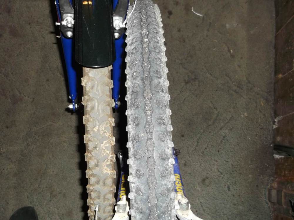 marvelo Napisano 2 Stycznia 2023 Napisano 2 Stycznia 2023 3 godziny temu, Maciek.B napisał: Wejdzie, czy nie... Ma sens, czy nie... Nie ma to znaczenia. Wieksze kola, na ktore namawiają znajomi kolegi @BoNaParter, mają sens gdy mowimy o zmianie calego roweru na taki, ktory ma geometrię ramy przystosowaną pod wieksze koła. W rowerach o wiekszych kołach, osie kół są wyzej, ale oś suportu pozostaje na podobnej wysokości co w retro 26. A zakładając wieksze koła do roweru ktory opuscil fabrykę jako 26'er podnosimy niepotrzebnie srodek ciezkosci, co sprawi, ze rower nie bedzie lepszy tylko odwrotnie. Ale nawet tylko zmieniając opony (różna szerokość, a co za tym idzie wysokość) na tej samej obręczy możemy w znacznym stopniu zmieniać efektywną wielkość kół, no i która to jest ta właściwa? Podniesienie osi suportu czasem jest wręcz zaletą, bo wzrasta dzielność terenowa (rzadziej zaczepiamy pedałem o koleiny, kamienie, korzenie). Na wyższym profilu opony wzrasta też parametr określany jako ciąg/ślad widelca (ang. trail), co też zwykle działa korzystnie i uspokaja prowadzenie w terenie. Różnica pomiędzy promieniem obręczy 26" (559mm) a 27.5" (584mm) to 12.5 mm. Różnica pomiędzy wysokością profilu opon na poniższych zdjęciach (obie na obręczy 26") to nawet nieco więcej i zaręczam, że np. mój Bianchi zachowuje się w terenie o niebo lepiej na oponach o maksymalnej szerokości, jaka się mieści w ramie, po części właśnie w powodu wzrostu realnej średnicy koła. Na oponach pokroju Maxxis FlyWeight (realnie ze 45 mm szerokości) to już nie to, pomimo dużo niższej masy. Dlatego ja bym do tego Gianta założył najgrubsze opony jakie się zmieszczą na koło 26", a drugie koła ewentualnie zrobił z obręczami 28" i oponami na szosę (tak jaj to robił Decathlon). Z 27.5 cala szkoda zachodu. Dwie różne opony na obręczy 26". Widać różnicę w realnej wielkości koła?