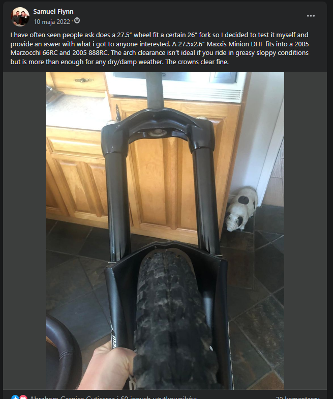 Michal_288 Napisano 26 Kwietnia 2023 Napisano 26 Kwietnia 2023 Jeśli dobrze zmierzyłem to 66 2007 ma 35,5 od środka osi a 888 o centa więcej czyli 36,5. Jak masz oś 15 to zrobisz sobie offsetowe fasolki do 20 to trochę mm przybędzie a jak wytrzaśniesz skądś golenie od 888 to raczej większość 27,5 powinna podjeść. 4 godziny temu, Kingins napisał: 27.5x2.8 wchodzi i widzę , że jest jeszcze miejsce. Tam prawie nie ma bierznika 😂 Pisałem że zależy od opony i ich profilów bo na papierze to jedno w realu to drugie, +zależy od obręczy