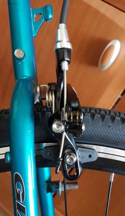 maniana007 Napisano 7 Września 2023 Autor Napisano 7 Września 2023 Mały update: w rowerze siedzi już komplet tektro r369. Jak widać zapas jeśli chodzi o długość ramion jest spory a z przodu to nawet w drugą stronę prawie zabrakło (od góry). Zapas na długość wynosi około 2 cm więc sporo ale wolałem dmuchać na zimne i brać dłuższe niż na styk. Wygląda na to, że długość ramion 60 mm byłoby w sam raz. Między oponą a szczęką/ramą zrobiło się ciut więcej miejsca z tyłu - koła i opony identyczne do poprzednich 700x35C. Koleś który to montował mówił, że trzeba było rozwiercać trochę dziury. Czyli średnica otworu jednak nie pasowała do śrub montażowych hamulców. Dałem im do montażu jedną tulejkę 3 cm ale użyli swojej. Klamki 3x8 ST-EF65 v-brake/canti na cztery paluchy też działają jak należy. Przestawili oczywiście dźwigienkę (śrubę?) od dołu pod canti. To tyle w temacie hamulców i klamkomanetek do nich. Dzięki wszystkim za pomoc. 2 Cytuj