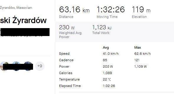 KNKS Napisano 1 Lutego 2024 Napisano 1 Lutego 2024 Tu nie chodzi o to żeby chwalić się kto ile kilometrów, ani kto ile watów. Wstawiłem wykres tylko po to żeby specjaliści od ścieżek rowerowych i pedałów platformowych nie piszczeli, że 41km/h to niemożliwe jest 😆 A to tylko prowincjonalne zawody amatorów na tak strasznie płaskiej trasie, ze z nudów umrzeć można. Chciałem pokazać że średnia, całkowicie nieosiągalna dla kolarza jadącego solo, jest już jak najbardziej realna dla mocnej grupy. I nie musi to być peleton kilkudziesięciu zawodników, gdzie zajmujesz miejsce po środku i utrzymujesz prędkość. Wystarczy grupa w okolicach 4-8 kolarzy lecących po zmianach. Jeżdżąc samemu rzadko przekraczam 31,5km/h, jadąc w peletonie zdarza się 40km/h . I gdzie ta średnia ? Mam z niej wyciągnąć średnią żeby wiedzieć czy jestem na poziomie podłogi czy sufitu ? 😁. Cytuj
