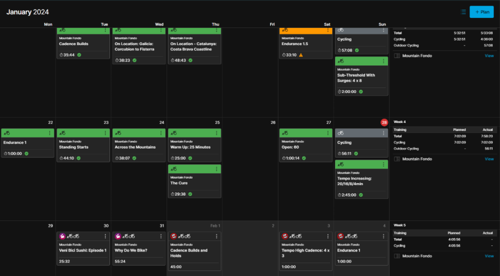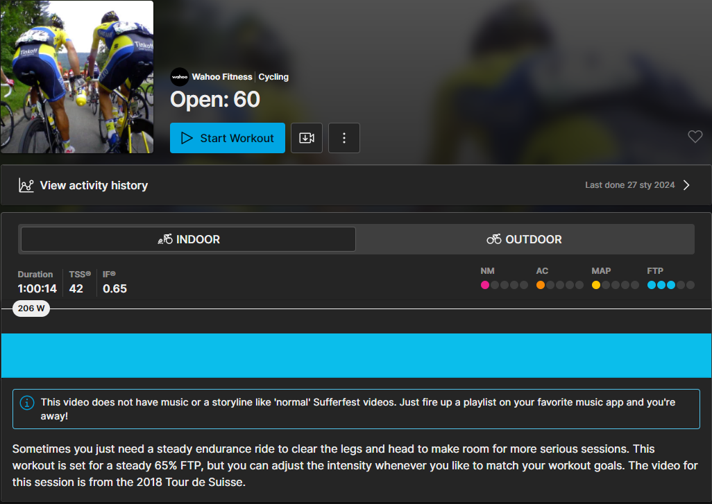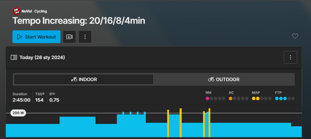 spidelli Napisano 28 Stycznia 2024 Autor Napisano 28 Stycznia 2024 (edytowane) Taki plan... Czy one są mocne i częste - nie wiem, po prostu dla mnie są ostre. Ale nikt mi nie kazał jeździć godzinę po górkach przed interwałami Poza tym ten plan jest urozmaicony. Wczoraj była godzina na lajcie, max 134 W. Dziś ostrzej. Jutro wolne. Potem 2 dni luźniutkie, trzeci dzień z interwałami (ale praktycznie poniżej mocy progowej): To nie jest tak, że ja jadę non stop ostre interwały. Po prostu są cięższe jednostki. W teście wyszło, że nic nie wyszło ze mnie nie sprinter i pewnie dlatego mnie męczą. Ale może masz rację, że tego za dużo Z drugiej strony, na Rouvy też mi się zdarzało przesadzić - wkręcisz się w jakąś gonitwę, a potem się zsuwasz z roweru na koniec Ten wpis wyżej to dzisiejszy trening - Tempo Increasing - już ten niebieski grzebyk dał mi popalić, a potem te 4 żółte ząbki. Ale spójrz na ich oznaczenia - te kolorowe punkciki najwyższą wartość miało FTP: 3/5. Czyli po prostu to nie był morderczy trening, ja jestem kapeć. Edytowane 28 Stycznia 2024 przez spidelli Cytuj