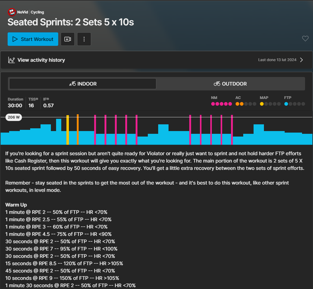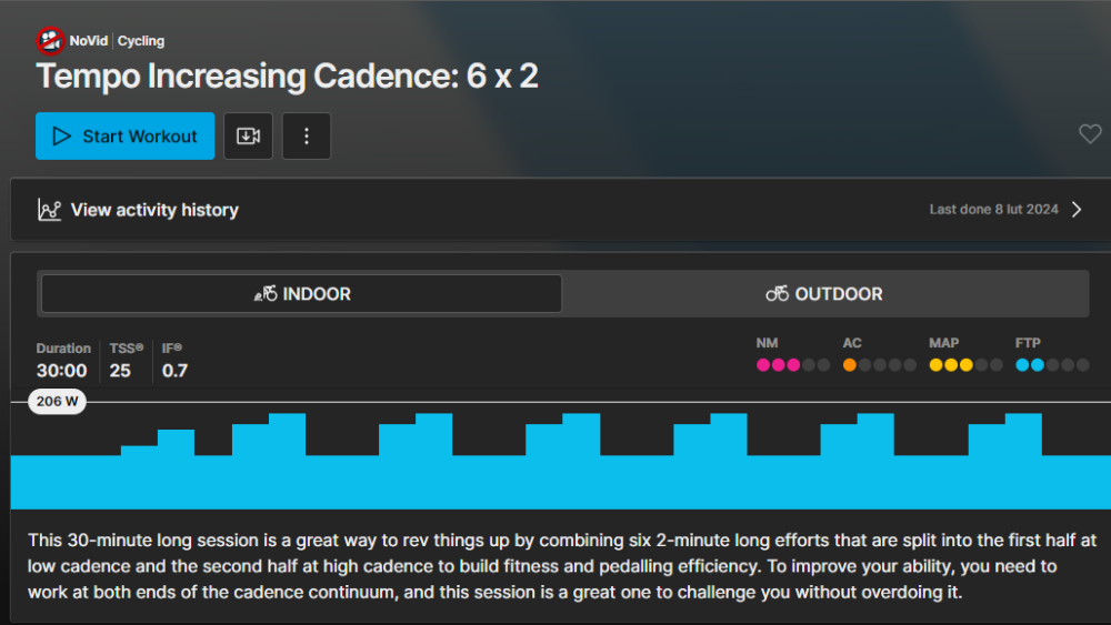 spidelli Napisano 19 Lutego 2024 Autor Napisano 19 Lutego 2024 (edytowane) Nie, spokojnie, to jest opis przedtreningowy W trakcie komentarze są krótkie - są to albo jakieś uszczegółowienia, typu "najlepiej stań w korbach, chyba że urwiesz trenażer", albo sprinty siedzące albo jakieś dodatkowe wyjaśnienia czy motywatory. Moja optymalna kadencja będzie gdzieś koło 80 rpm, przy mniejszej mocy 90 też nie jest problemem. Ale utrzymanie przez 25 minut to ponad moje siły Przynajmniej wczoraj. Zeszły tydzień zawierał takie ćwiczenia na kadencję ale to był krótkie interwały i na niskiej mocy - i do 120. Były też na większej - ten przejazd po Tasmanii, kiedy trzeba było cisnąć krótkie ale liczne podjazdy. Czasami są też ćwiczenia na deptanie kapuchy, na kadencji 50 - 60 rpm. Tylko te tygodniowe trwają poniżej godziny, a w weekend 2 + 3. Tu półgodzinny trening sprzed tygodnia: A wcześniej 20-min. rozgrzewczka: A to jeszcze wcześniejszy: Praktycznie od kiedy zacząłem plan to cały czas czuję nogi (nie tylko zapach ). Zdecydowanie do tej pory chyba nie jeździłem tak intensywnie, jak wpadło jakieś wariactwo w Rouvy, to potem 2 dni przerwy, generalnie wsiadałem jak mi się znowu zachciało. A teraz wsiadam, bo muszę i czasami mam ochotę nie robić treningu Pewnie, że chcę poprawić swoje osiągi ale jest to też taki "eksperyment" a raczej zabawa w eksperyment. Polar pisze, że aby był Progres, trzeba stale delikatnie zwiększać obciążenie, rysują się wtedy te dwie średnie - 30-dniowa jako "tolerancja" czyli punkt odniesienia, i 7- dniowa pokazująca bieżący poziom czyli Regres-Utrzymanie-Progres-Przeciążenie. Załóżmy teraz, że plan Wahoo oparty jest o jakieś "naukowe" przesłanki czyli spełnia to założenie o progresji obciążenia (nawet jak jest wygenerowany automatycznie) w oparciu o test, który daje poziomy odniesienia dla tych wszystkich treningów opartych na % FTP, HR itp. Najbardziej mi szkoda, że nie mam już siły na jazdę rekreacyjną, czy to w Rouvy czy też na zewnątrz, w słoneczną niedzielę Edytowane 19 Lutego 2024 przez spidelli Cytuj