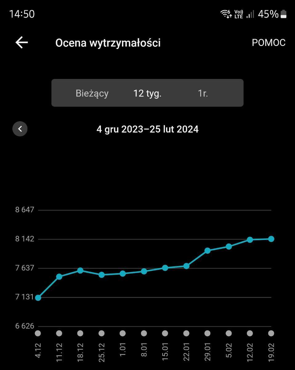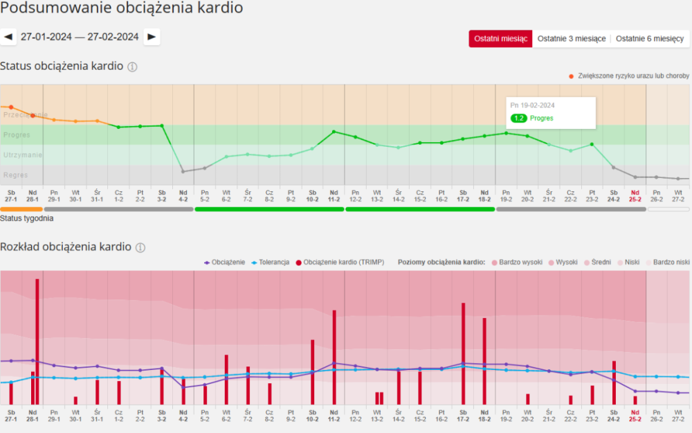 Trochę inaczej wygląda skala po lewej - pomarańczowy zakres Duże zmęczenie jest b. długi. Pytanie czy w lutym nastąpiła wg tego wykresu jakaś adaptacja? Niestety nie da się tego pokazać w innym układzie, np. definiując zakres czasowy samodzielnie...