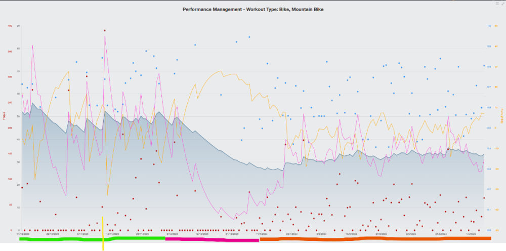 spidelli Napisano 7 Kwietnia 2024 Autor Napisano 7 Kwietnia 2024 (edytowane) Dziś zwieńczenie planu czyli Mountain Gran Fondo - u mnie to nie dzień wyścigu tylko drugi test 4DP. Nie znam jeszcze wyników. Kilka danych: 15 listopada ostatnia jazda outdoorowa na gravelu - 124 km i 1440 m przewyższenia. Późniejsze jazdy to MTB w pobliskim lesie. Od 11 grudnia do 7 stycznia praktycznie zerowa aktywność - jakieś spacery, przejażdżki na rowerze - w sumie tylko 7 dni z aktywnością, tydzień przedświąteczny 18 - 24 grudnia - nic, zero. 7 stycznia test kolarski wg zegarka Polar - niebawem zrobię drugi, żeby porównać wyniki. 14 stycznia - test Wahoo - 4DP test. 15 stycznia - 6 kwietnia - Plan Mountain Gran Fondo 7 kwietnia - drugi test 4DP Ale zanim przejdę do testu to tak kochane przez Was wykresiki: Polar: Zielone - sezon + Rouvy, żółta linia to symboliczne zakończenie sezonu na gravelu Purple - nicnierobienie Sraczka - Plan Mountain Gran Fondo To samo wg TP: Na obu wykresach widać ostre pikowanie w grudniu, z którego plan mnie nie wydobył. Pytanie czy plan był całkiem zły, czy możne trzeba było najpierw odbudować "bazę" - nie wiem, nie znam się No i wyniki testów: 14 stycznia: 7 kwietnia: FTP mnie spadło Edytowane 7 Kwietnia 2024 przez spidelli Cytuj