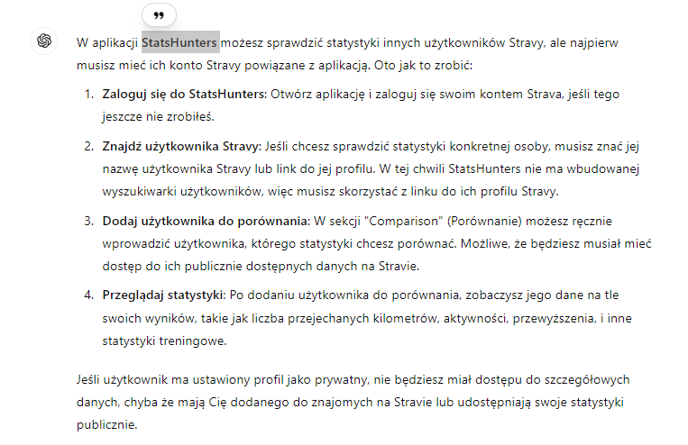Mentos Napisano 16 Października 2024 Napisano 16 Października 2024 (edytowane) No zadałem pytanie czatowi GPT czy są jakieś apki pozwalające na odnalezienie czyichś starszych Straviszonowych tras, podał że jak są publiczne to właśnie i np. te dwie apki StatsHunters i VeloViewer. No a jak widać potem pytałem jak to zrobić w tej pierwszej. Albo wygrzebał stare dane/funkcjonalności, może zamknięte, albo inteligencja o co zawsze ją podejrzewam jest 'gupia' 😉 Anyway gdyby ktoś miał pomysł jak znaleźć czyjeś starsze zapisane publiuczne na Stravie traski to proszę o sygnał. Edytowane 16 Października 2024 przez Mentos Cytuj